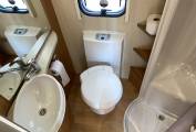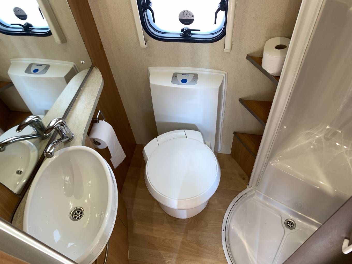The impressive washroom features a separate fully lined shower enclosure, hand basin and electric flush Thetford toilet.