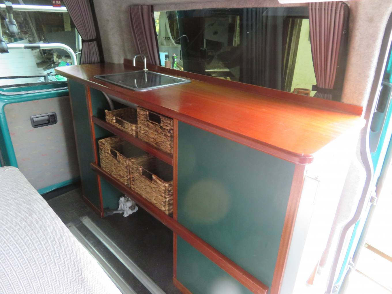 Hardwood Sapele worktops with shelves below and baskets