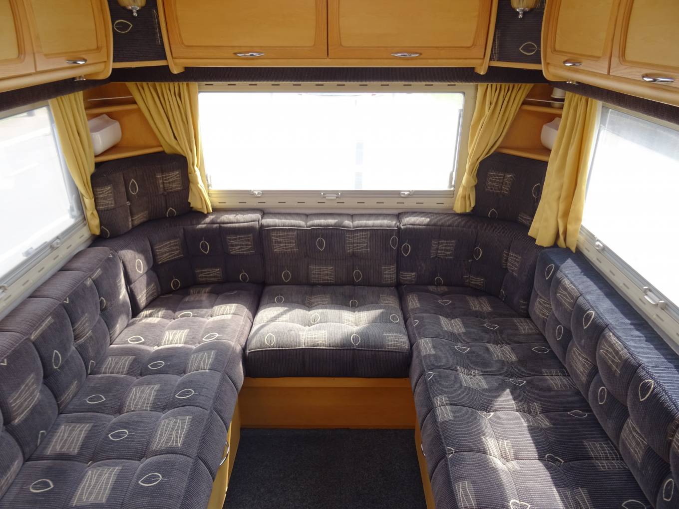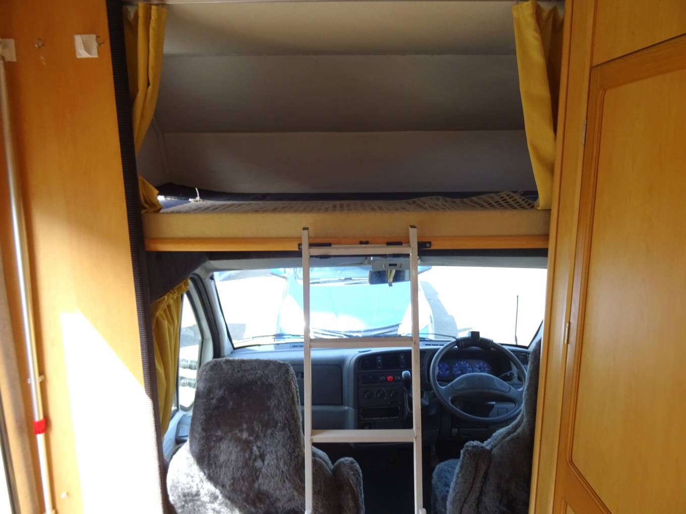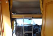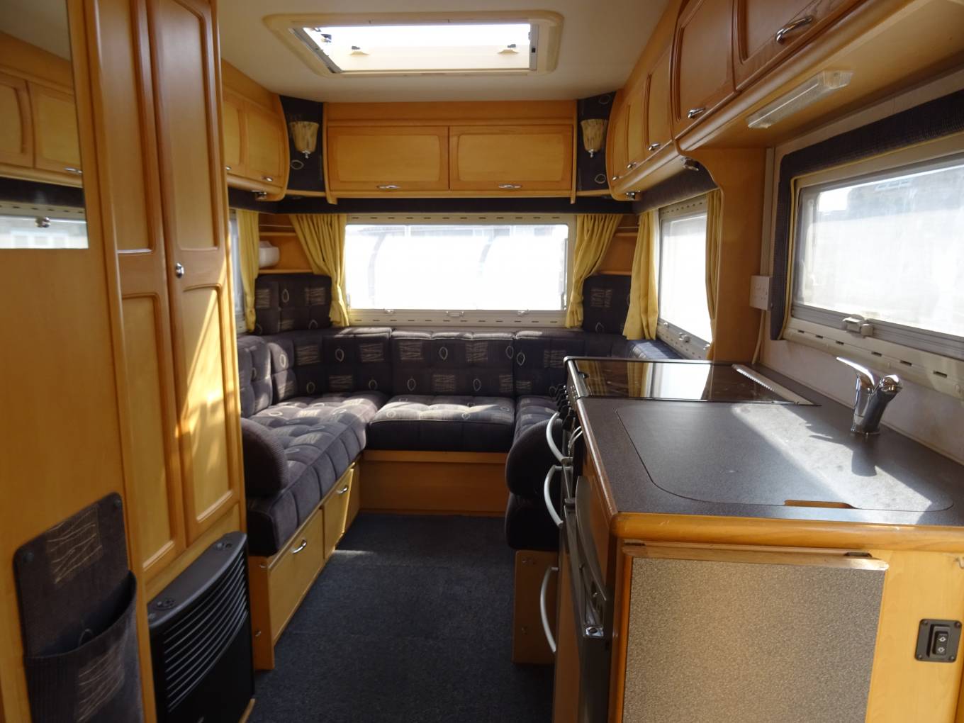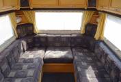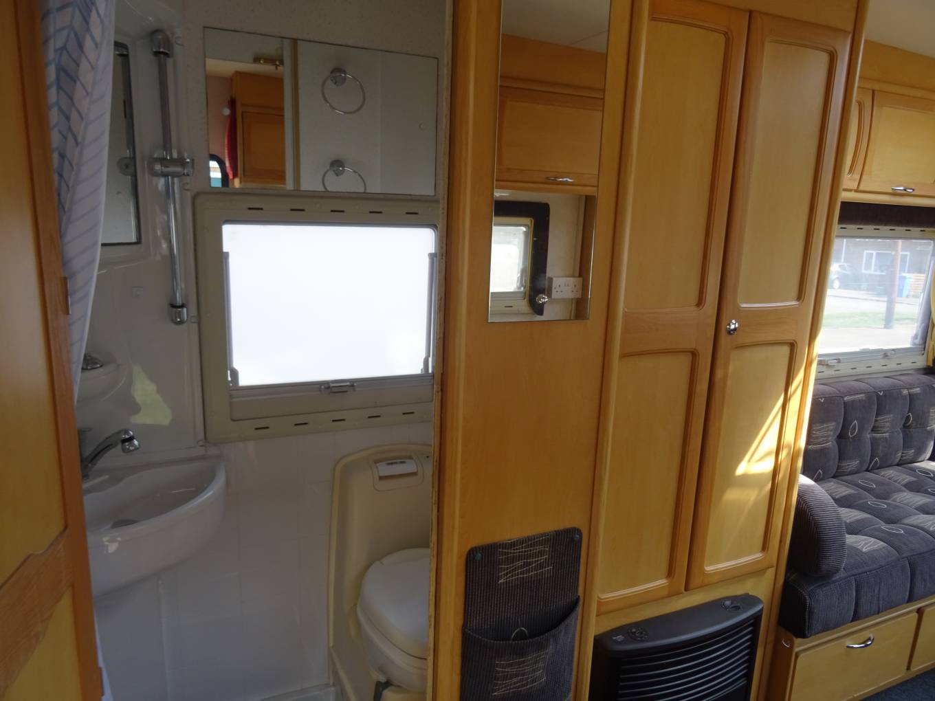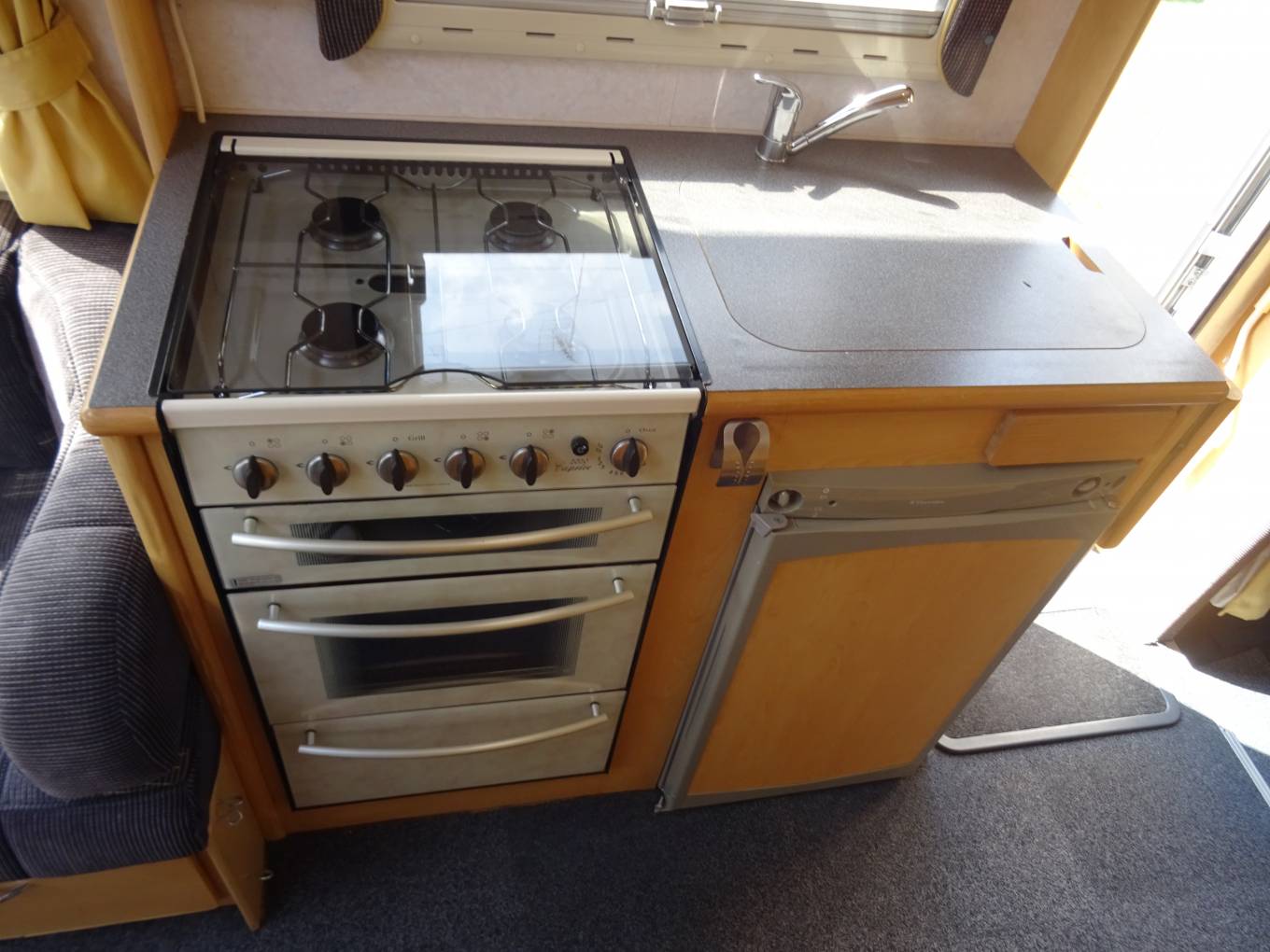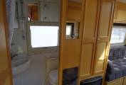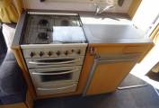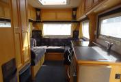 The kitchen is well equipped with sink and mixer tap, work top with extension, 3 way fridge and freezer box. The cooker is a good looker with 4 gas hob, grill and oven. Opposite is the hanging wardrobe. The washroom is integrated with flushable swivel toilet, shower (with curtain), basin and cabinet. There is a 2 berth over cab bed. As mentioned all aspects are in a very nice condition for the year. Lots of storage.