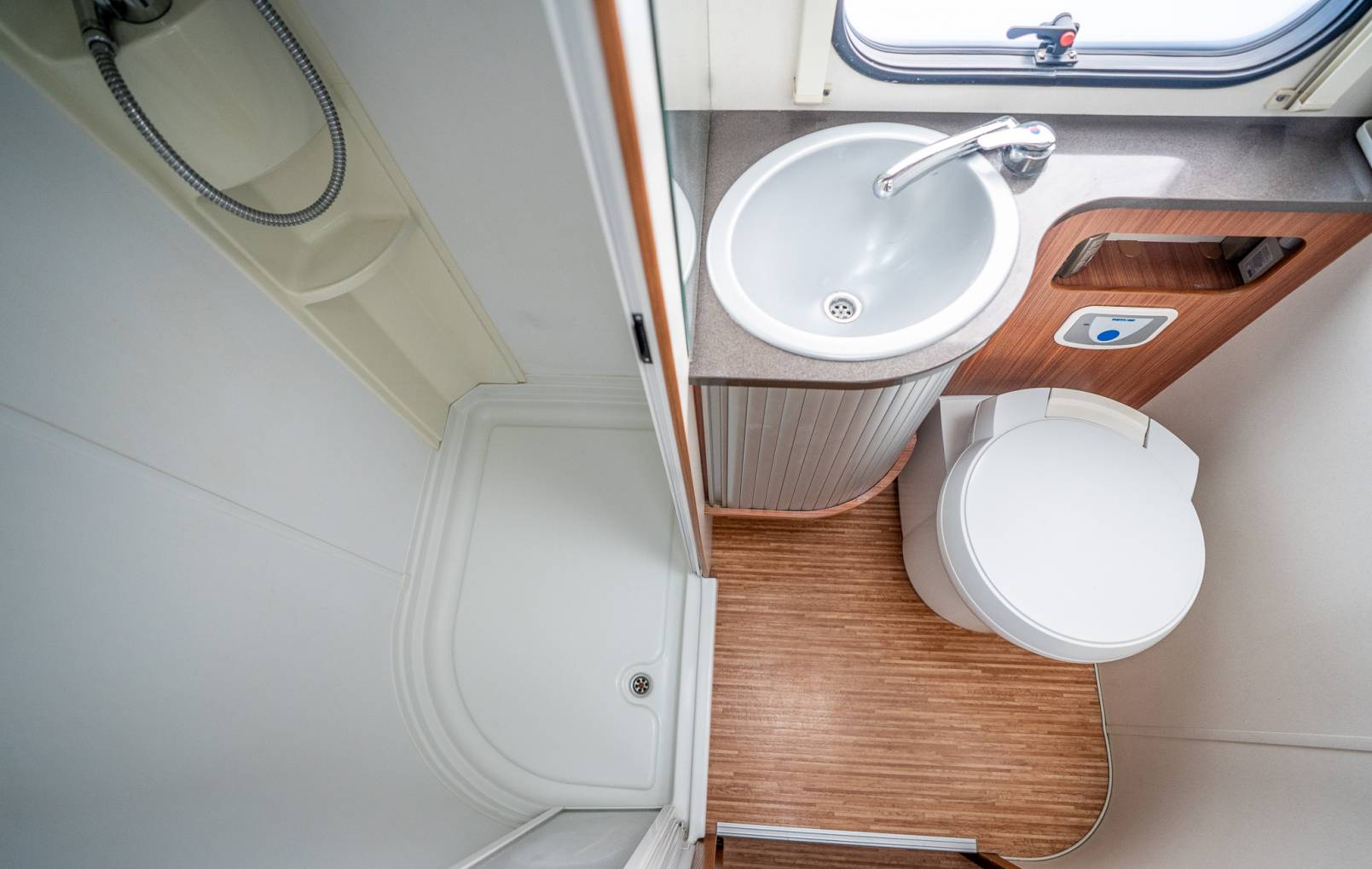 Bathroom - The Bathroom has an air of luxury without compromising on space. It is decorated with those classic wood panels that we see throughout the vehicle, but then separates with a divider to the shower area. Inside the main bathroom we also have a vanity sink, a Thetford Toilet w/Casette, and additional storage space.