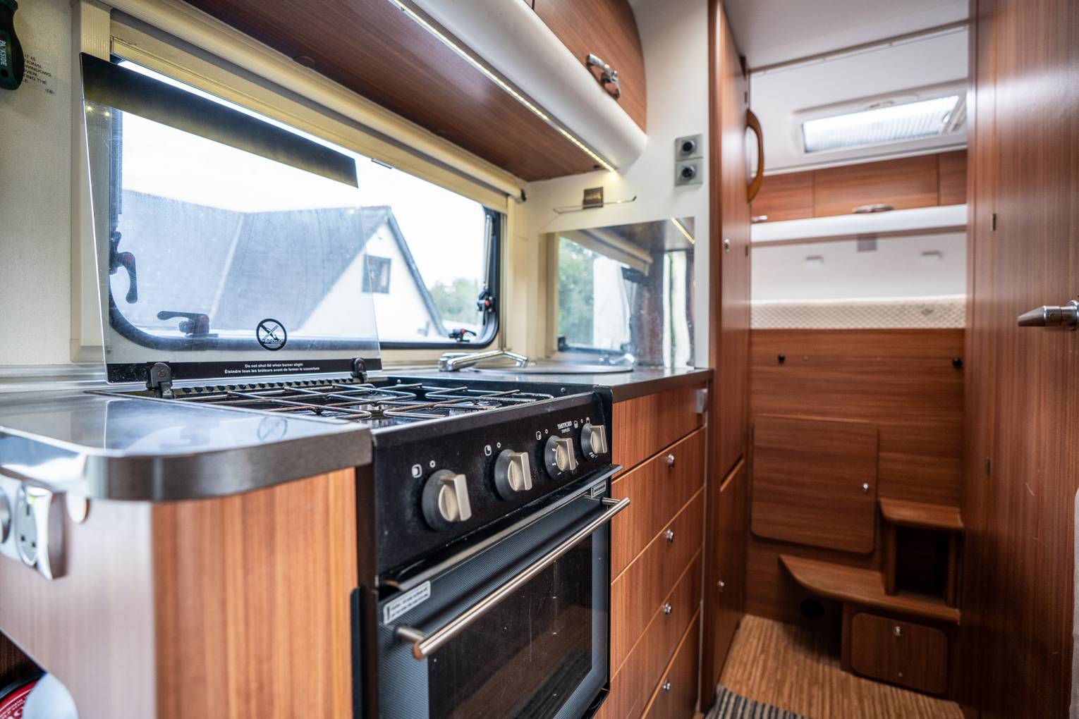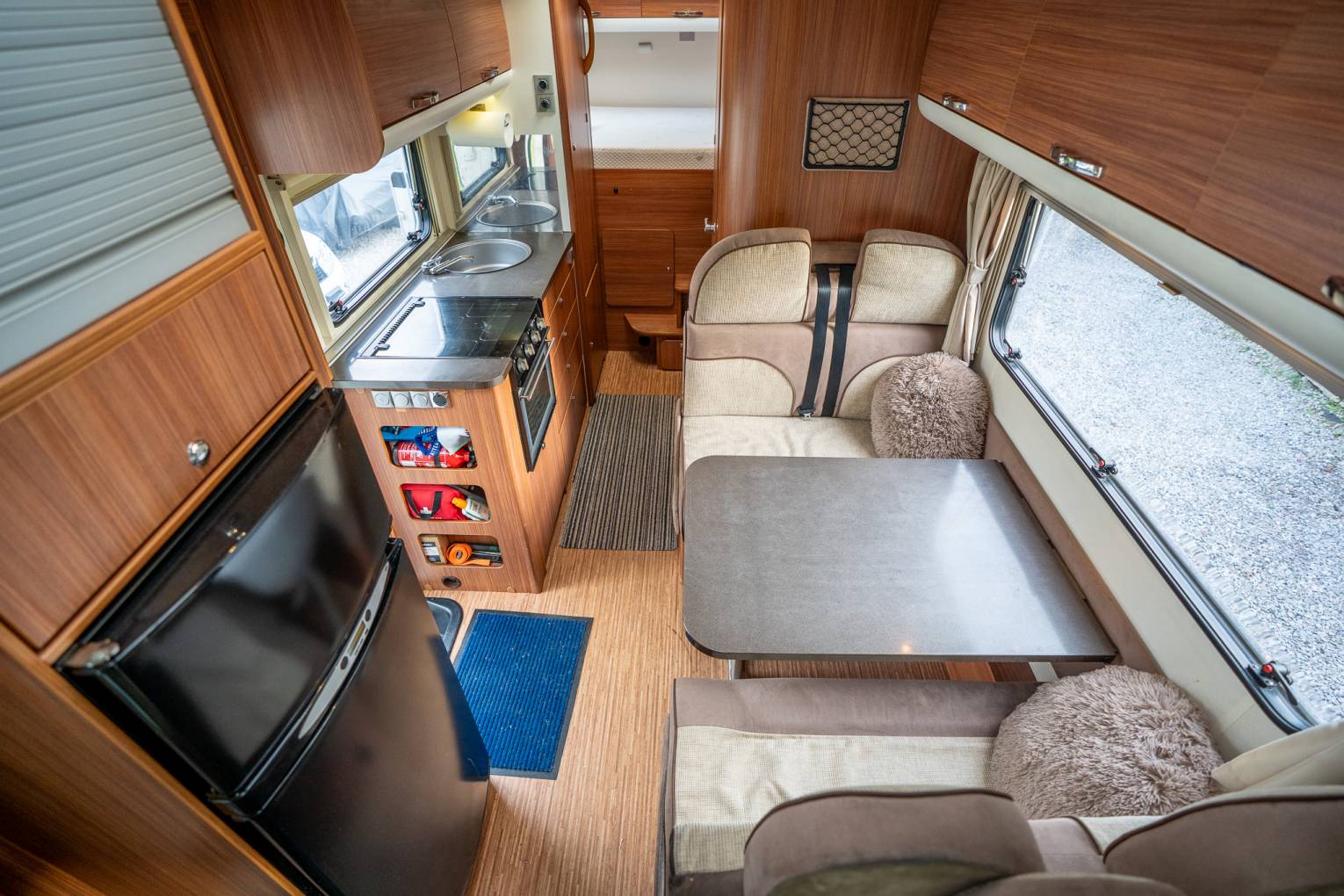 Kitchen - The kitchen area features all you would expect from a motorhome of this calibre - It comes complete with a Thetford Triple oven, 3 Gas Hobs, a full sized Fridge Freezer, plenty of cupboard and overhead locker space and some quirky extras such as a kitchen roll holder, and an additional plug socket so you can plug in those normally homebound cooking gadgets. Opposite a FireAngel Carbon Monoxide alarm will help keep you and your loved ones safe, whilst the intelligent Adria mains panel is easy to navigate.