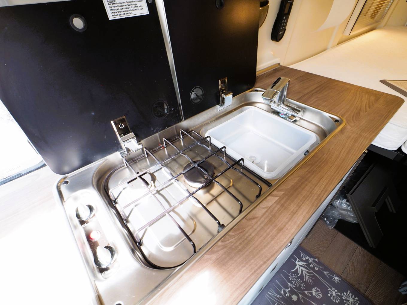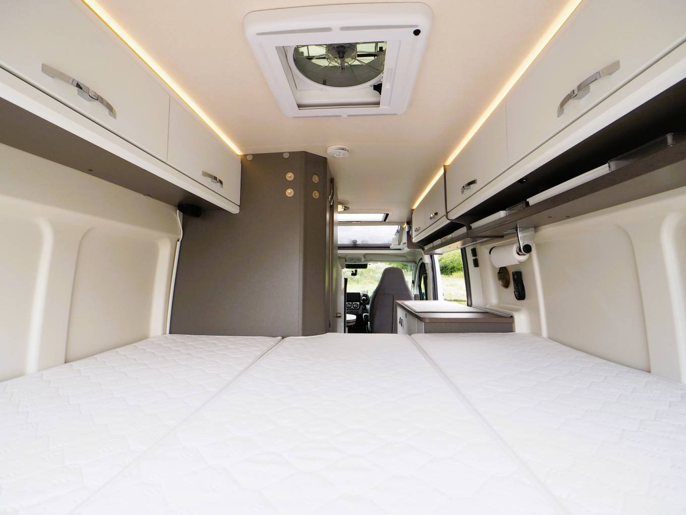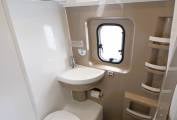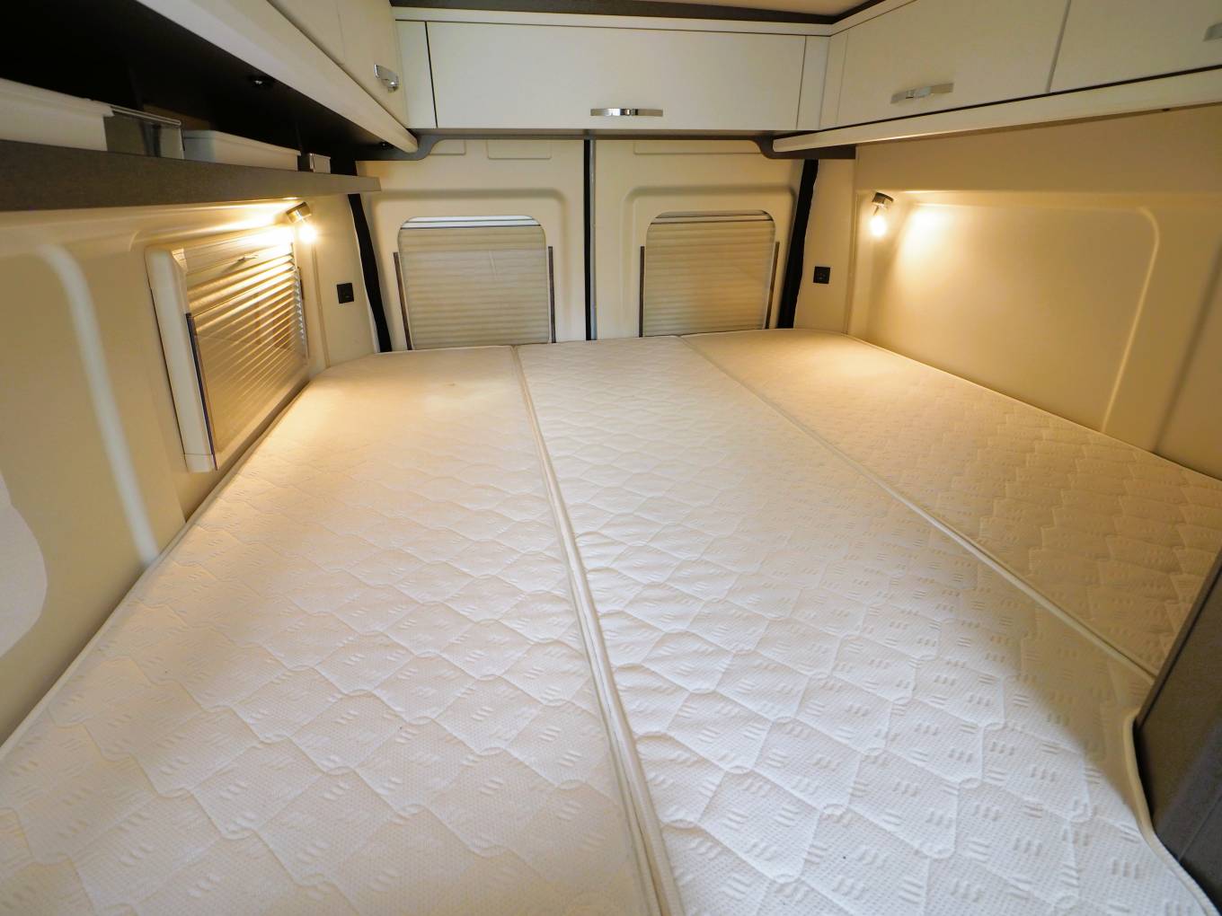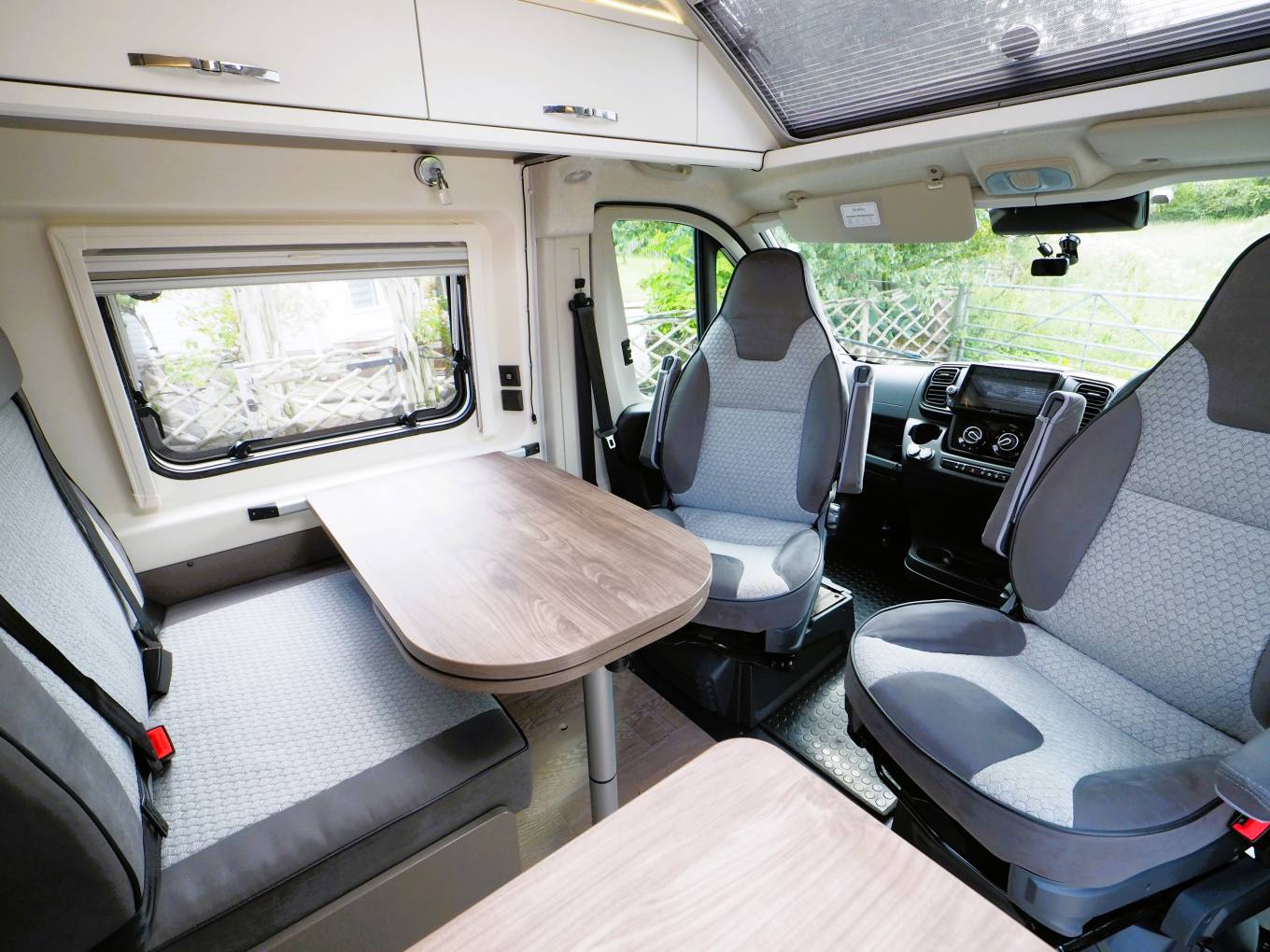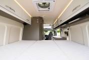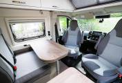 Up front there are all the expected driver and passenger comforts with swivel captain style chairs, cab air con, cruise control, entertainment system with apple and android car play, reversing camera screen, electric front windows and adjustable mirrors and Remis privacy blinds. Additional screen covers come with the van. A comfortable dinette provides the additional 2 person travel belts and is a great place to dine and entertain. The kitchen facilities include a two burner gas hob, sink with mixer tap, comressor fridge with freezer box and an external BBQ point to enable al fresco cooking. A private washroom provides a flushing cassette toilet, sink with mixer tap and shower. To the rear is the large double bed with storage under. Mosquito nets are fitted to the rear and side habitation doors. A Maxxair fan with remote control is fitted above the bed.