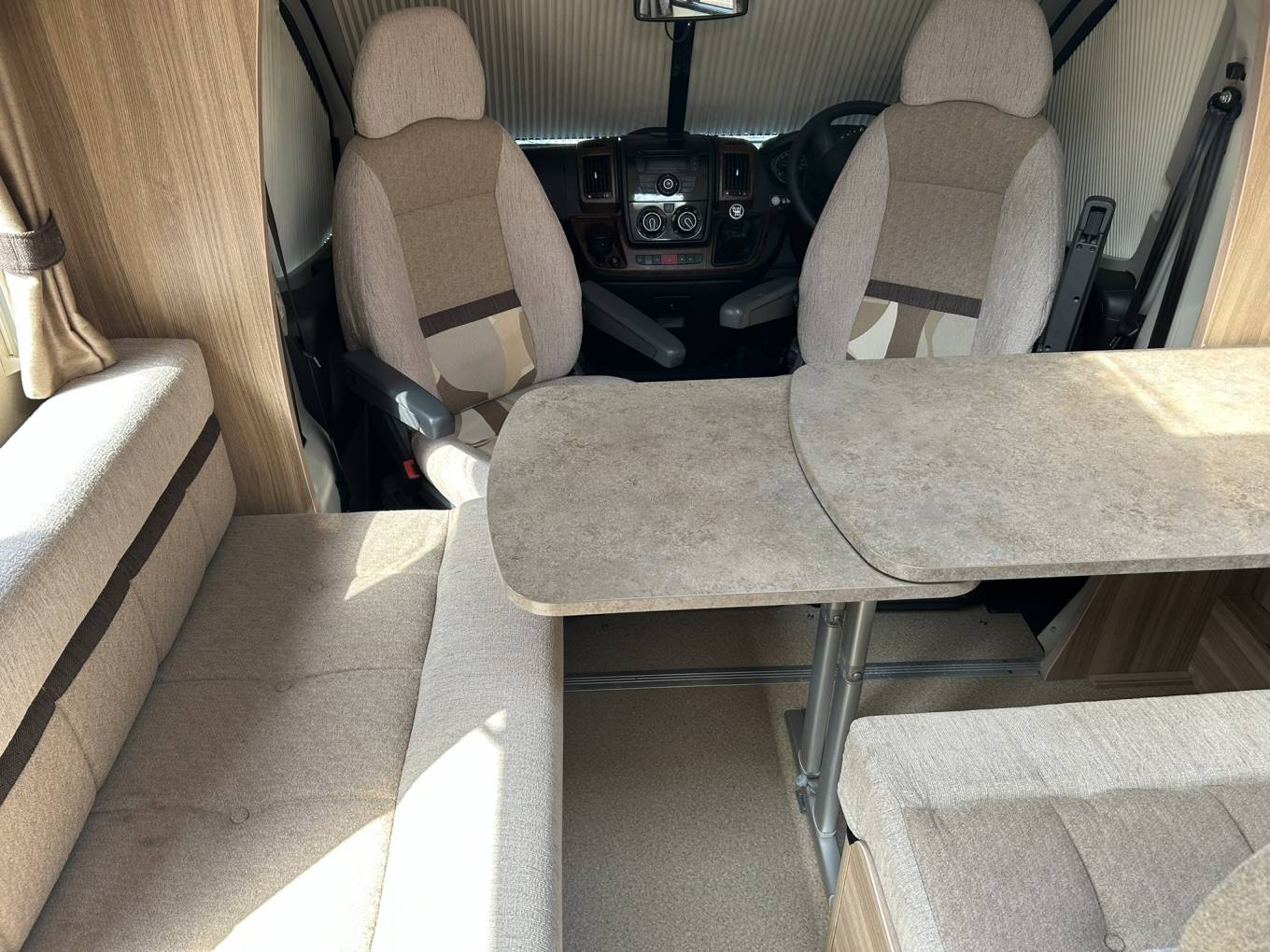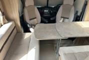 Coming back past the kitchen you will find a comfortable dining area with a forward facing bench with 2 seatbelts a side facing bench with storage below a large dining table and with the cab seats swivelled creates enough room to sit 6 comfortably. This converts to a double bed to complete the 4 berth configuration.