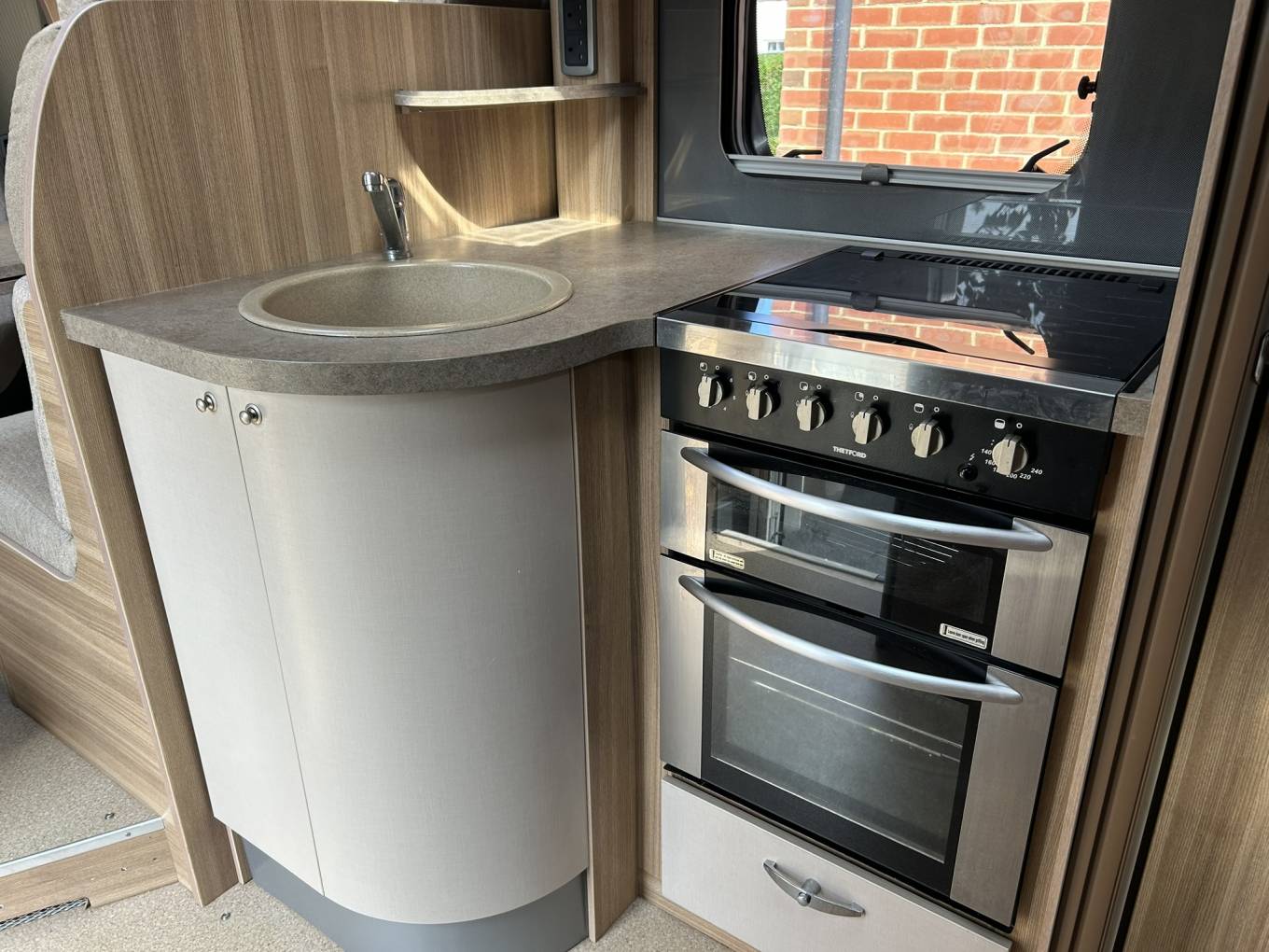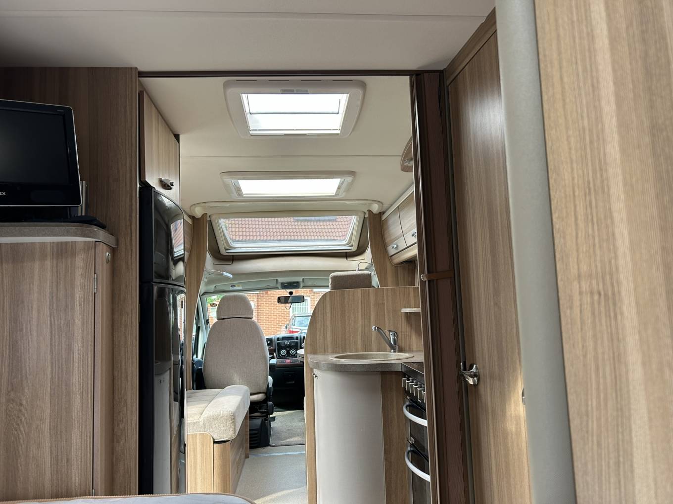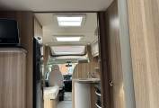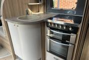 As you enter the van there is a fully equipped kitchen comprising of a large fridge freezer, oven with grill, duel fuel 4 burner hob, microwave, sink with mixer tap and plenty of cupboard space including a carousel unit for all your kitchen essentials.