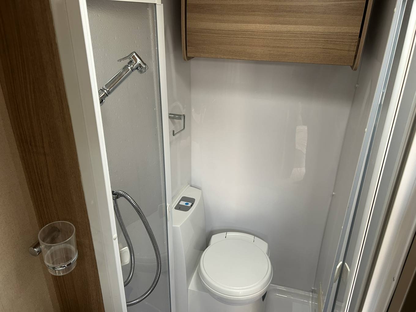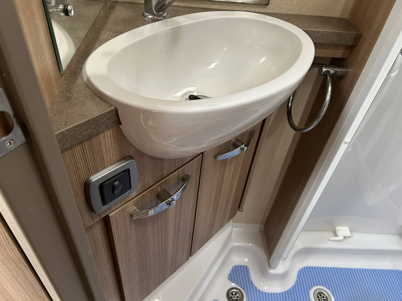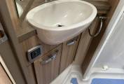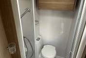 When you go to the rear on the left hand side is a large washroom with shower cubicle, hand basin with vanity unit, mirror and a cassette toilet. There is a screen that separates the main living area and the bedroom.