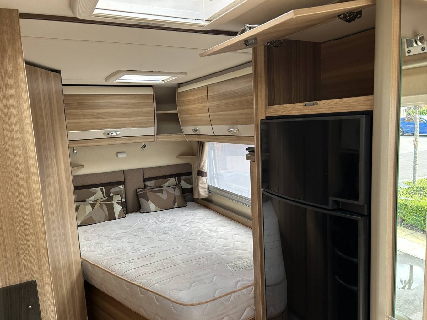 At the rear is a fixed French double bed with a skylight above and a large window to the right flooding the van with natural light. There is lots of locker space above and a wardrobe with plenty of hanging space.