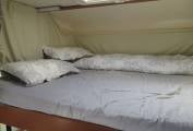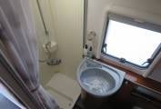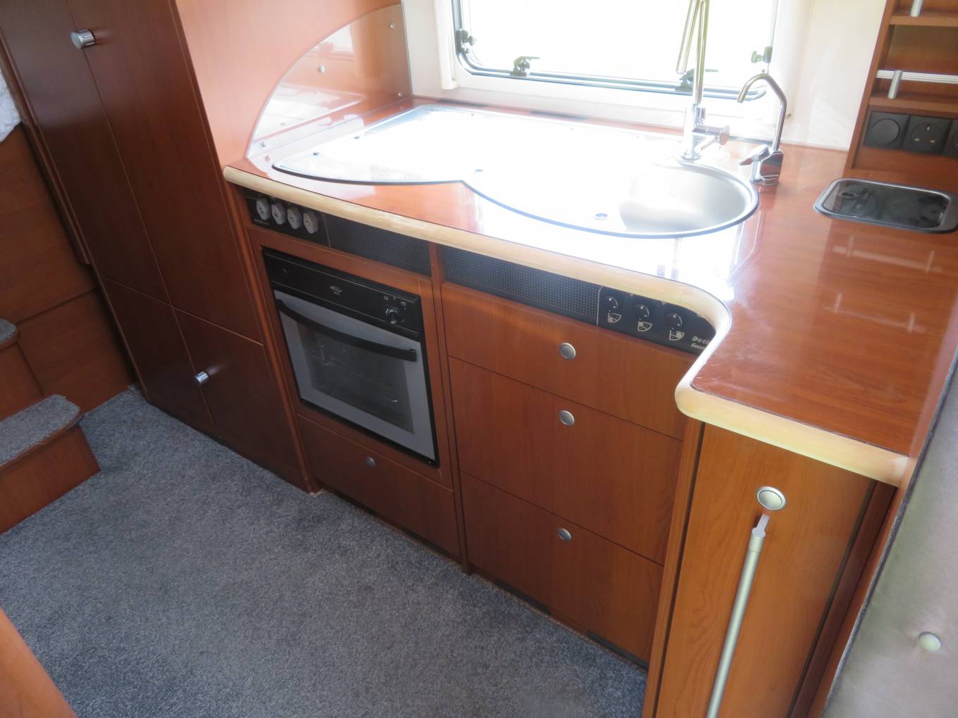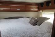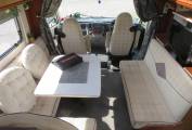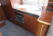 Firstly, we start at the rear with a huge fixed transverse bed. The bed can be raised to create another huge space in the garage below. Next is the washroom, this includes a shower, wash basin and toilet. As we walk forward we are greeted by the well equipped kitchen. Which consists of gas hob, oven, grill, wash basin and large separate fridge freezer. To the front is dinette. This is the perfect place to relax with plenty of room for all the family. Finally to the front is a large pull down double bed.