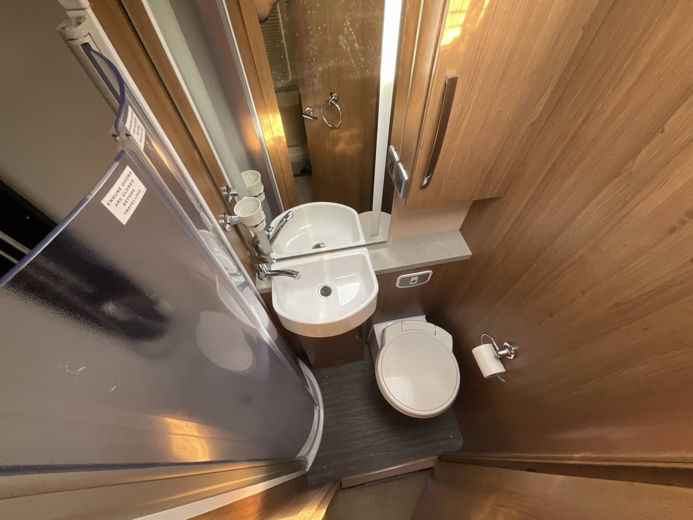 A well-appointed washroom offers a separate shower, cassette toilet, washbasin, vanity unit, and mirror – making it ideal for extended trips away from campsite facilities.