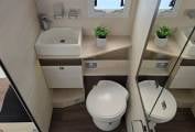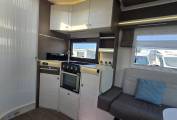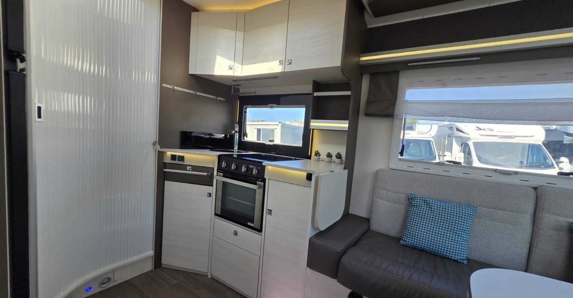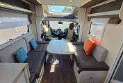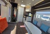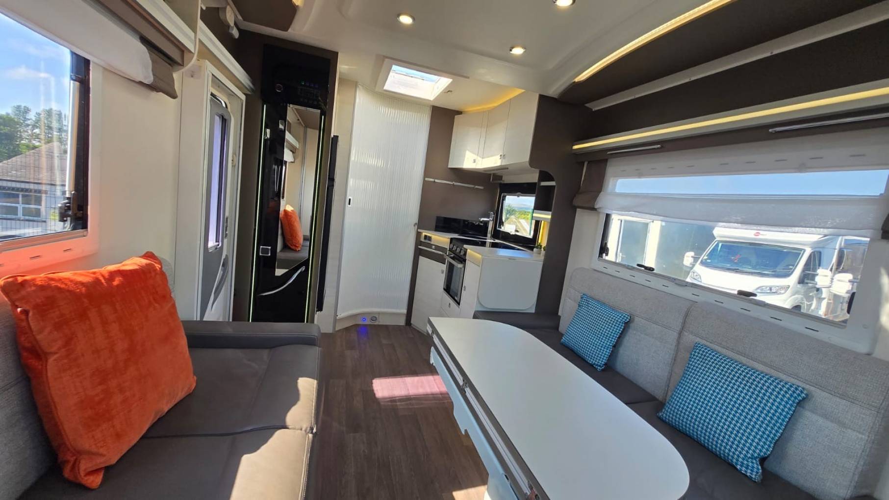 The spacious and light lounge has 2 bench seats sitting across from each other with an electric height adjustable dining table for eating or for socialising with the 2 cab seats able to swivel and it has an XXL electric drop down double bed with luxury mattress above. This area can easily be converted at night to make up the other double bed.