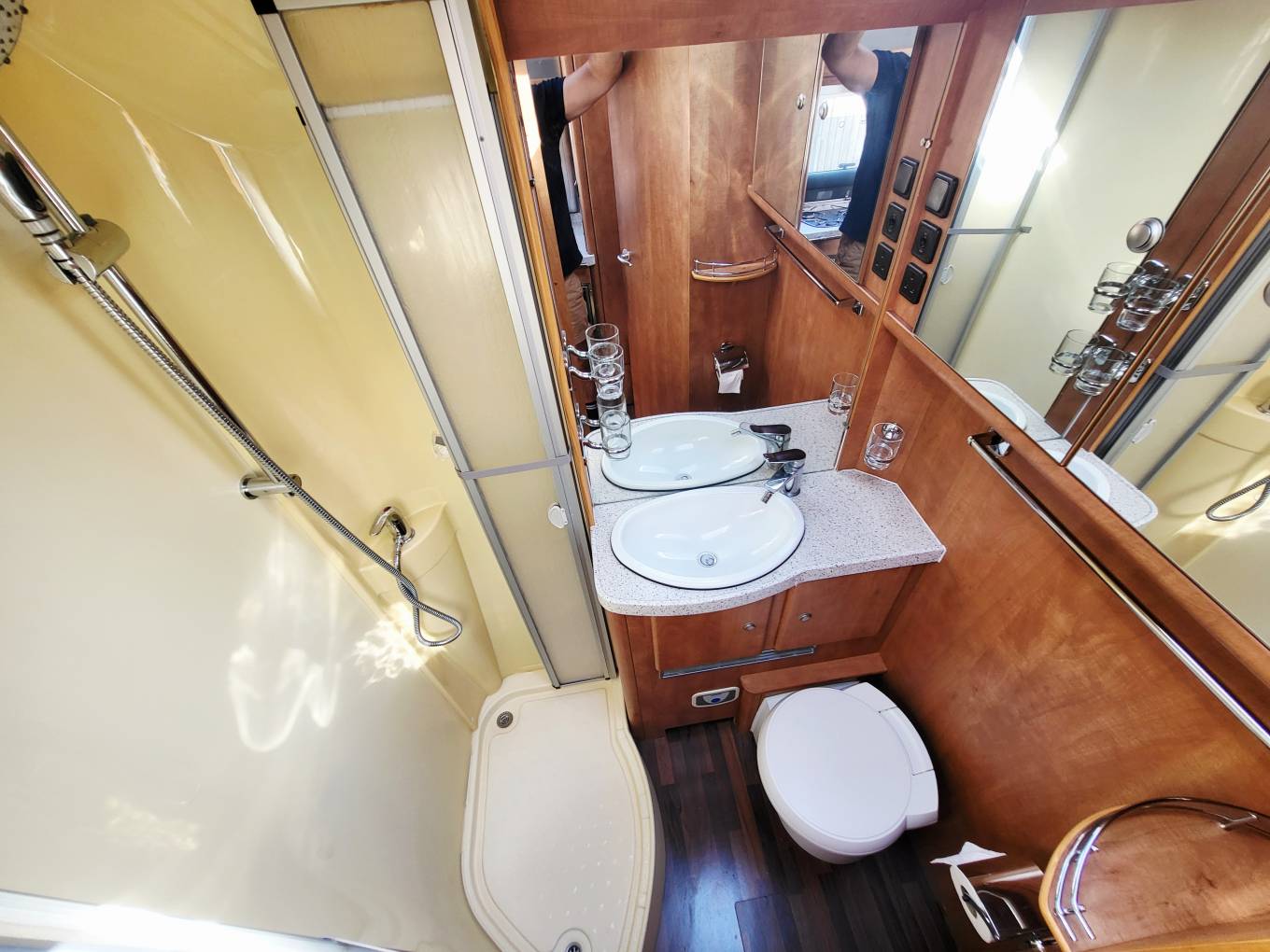 The spacious bathroom offers sink, cassette toilet and separate show cubicle