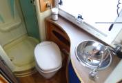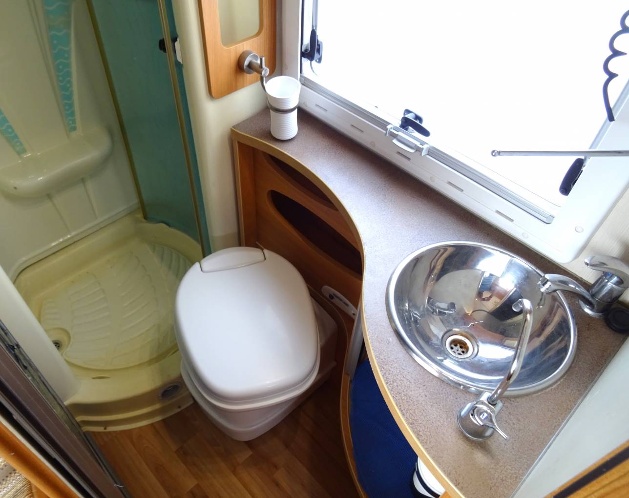 The washroom is adjacent and is comprised of a separate shower, Thetford cassette swivel toilet and hand washbasin with vanity unit and mirrored storage.