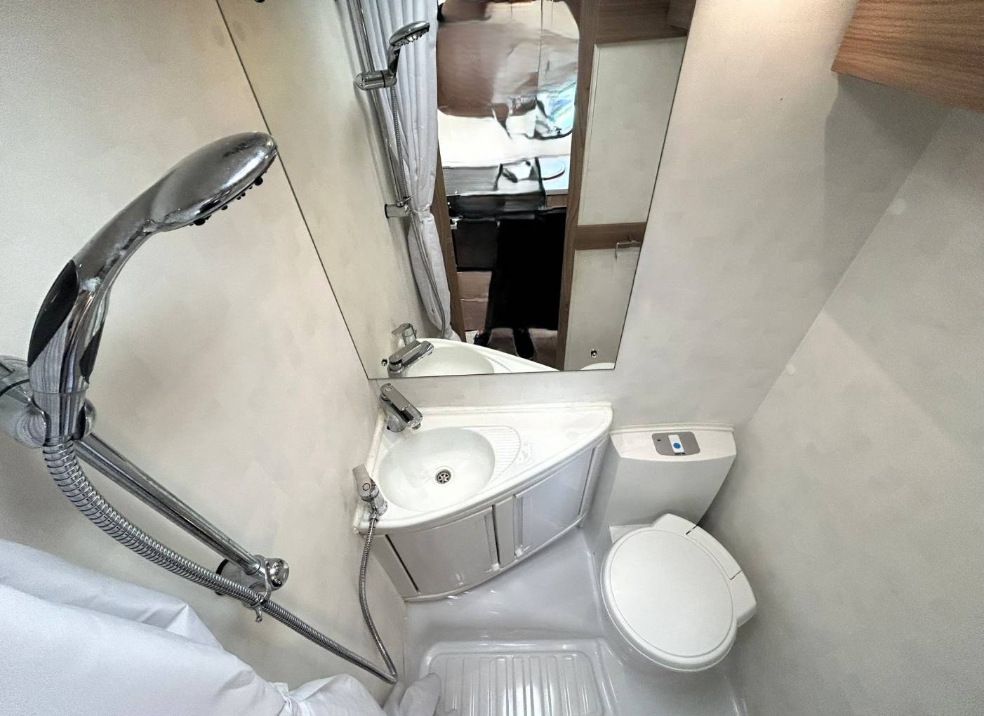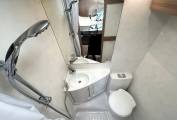 - Washroom with integrated shower, vanity unit with hand basin and a cassette toilet