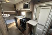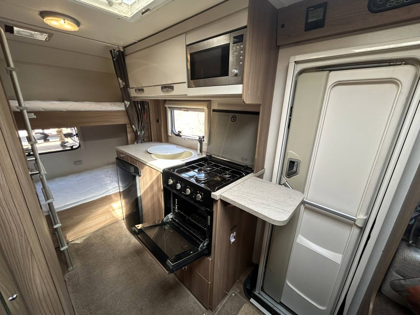 - Adult size Transverse bunk beds with folding lower bunk allowing the use of a large garage during transit