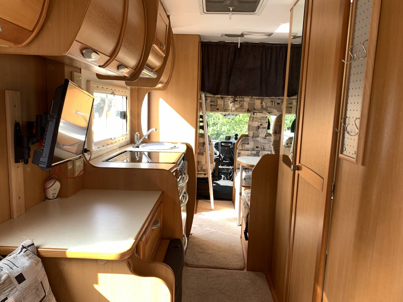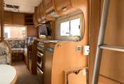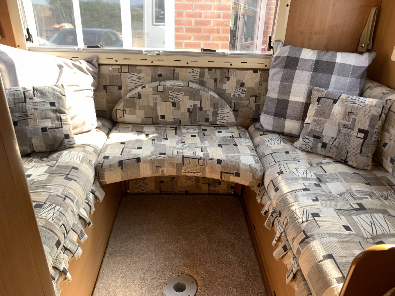 It has 3 dedicated sleeping areas and 2 lounges, the front pullman style with the 4 extra belts and the cosy wrap around rear TV lounge ideal when theBritsh weather is not so kind.