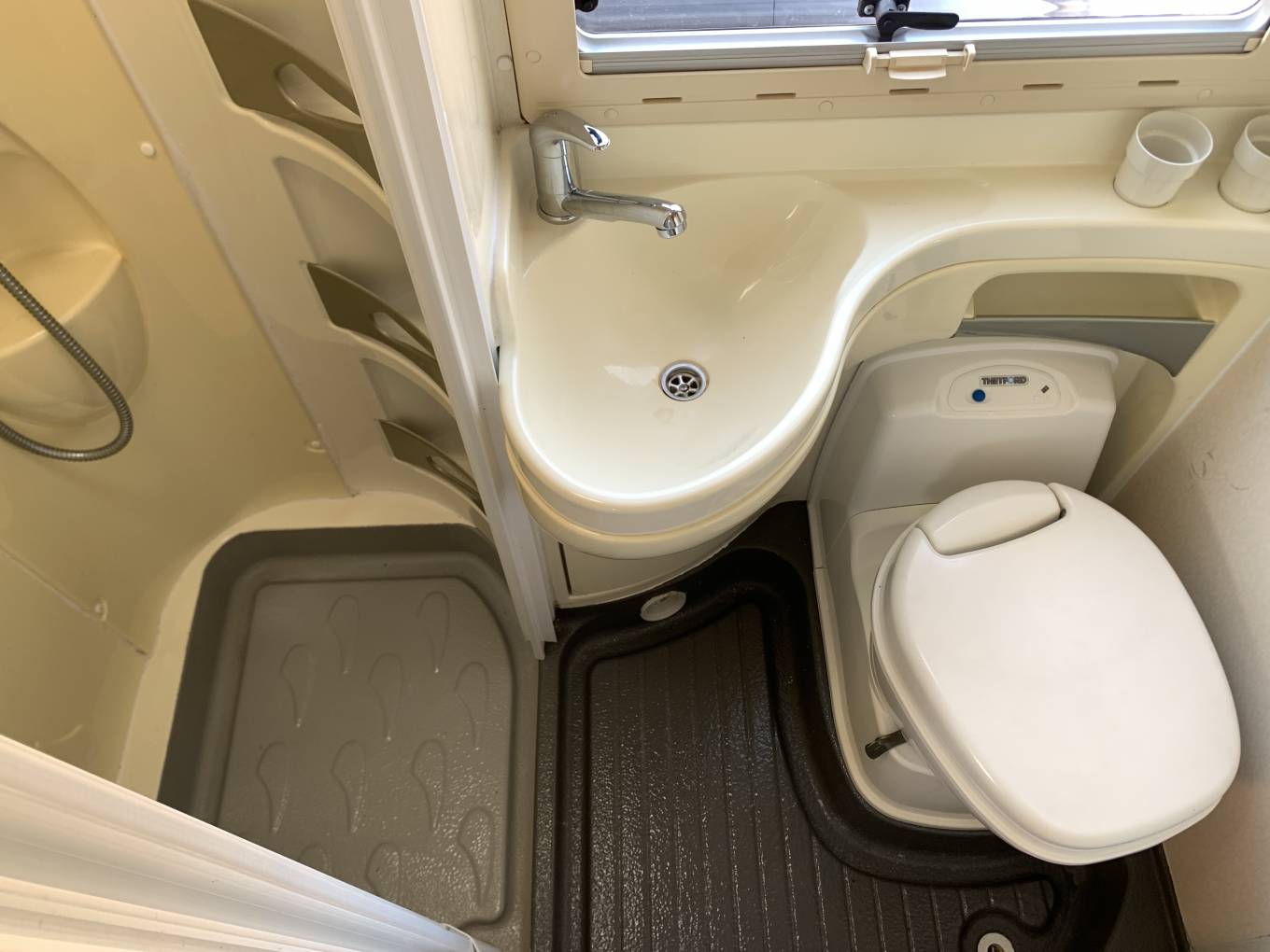 The washroom incorporates a seperate shower cubicle Hot and Cold water and a Thetford Electric flush Toilet.