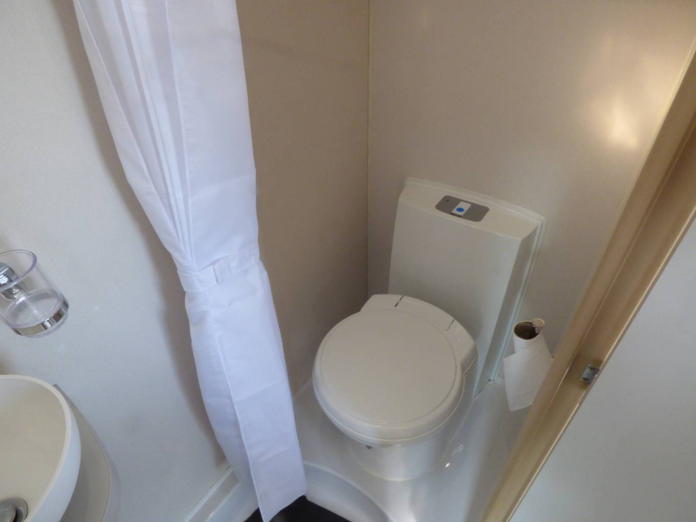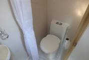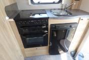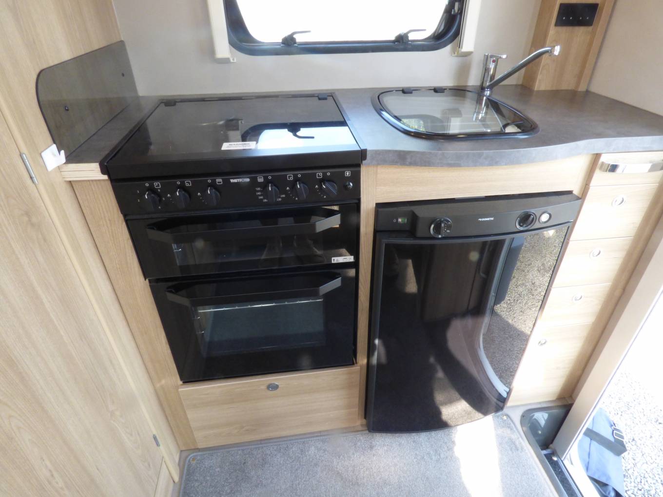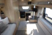 Behind the dinette area we have the wardrobe with hanging rail and opposite, above storage cupboards we find the TV. At the rear offside corner we have the washroom with vanity unit, washbasin, w.c. and head height shower, all next to the rear kitchen which comprises oven, separate grill, fridge with freezer box, 4 ring hob (one electric) and sink with drainer. A microwave is at head height next to a range of lockers and above drawers and slide out preparation area.