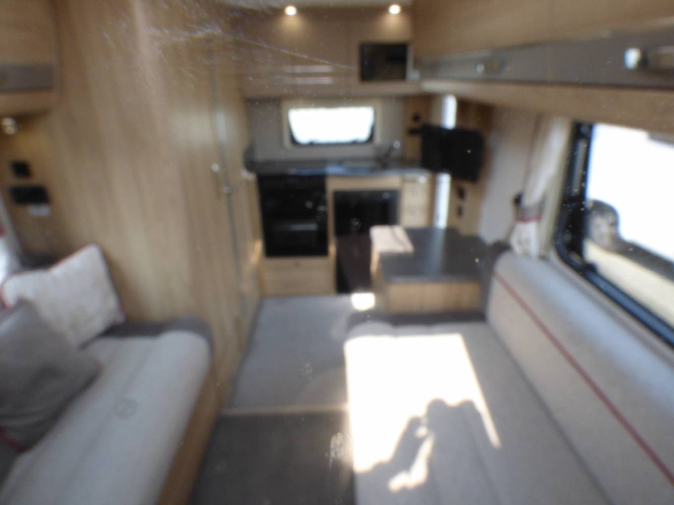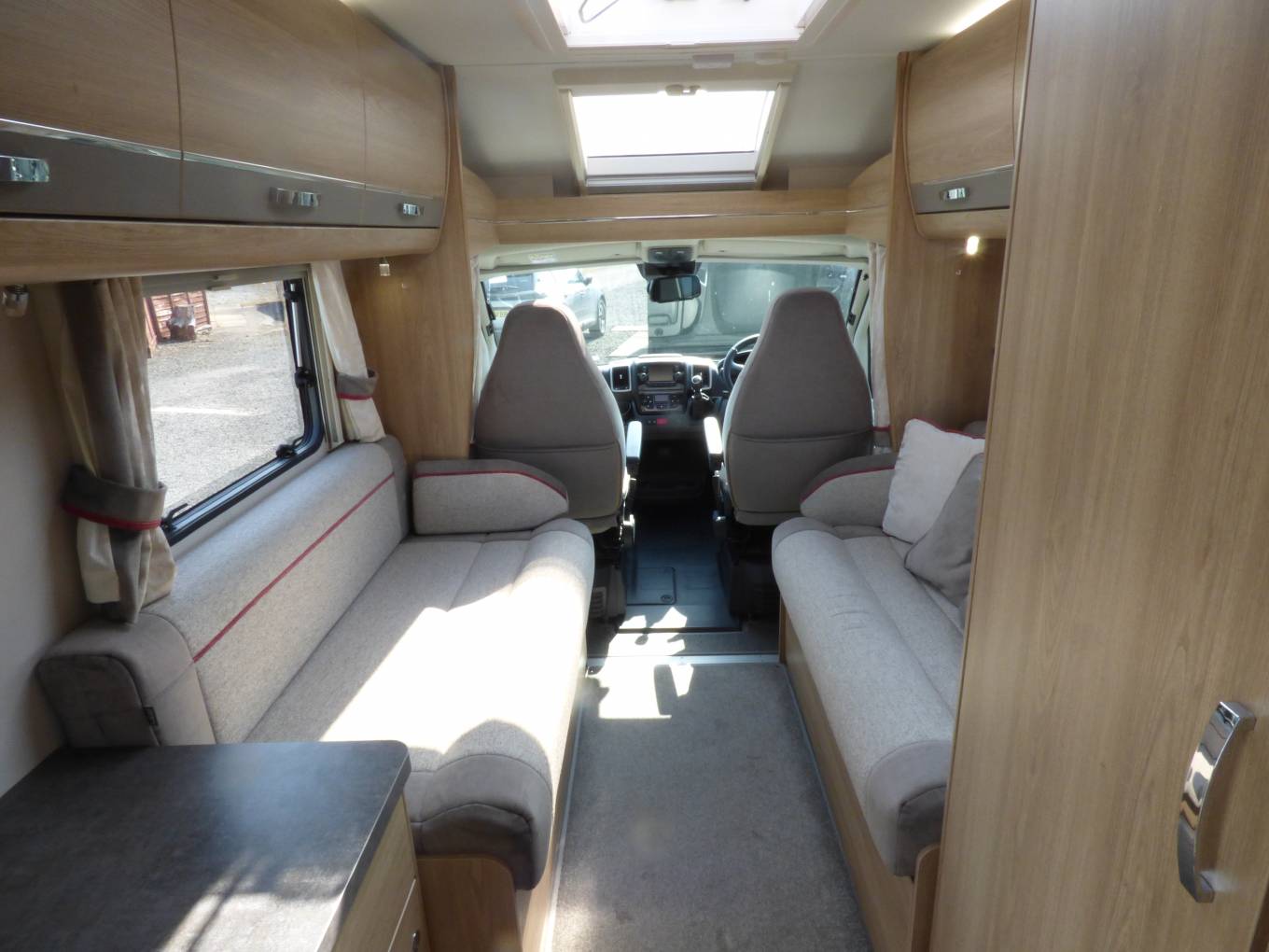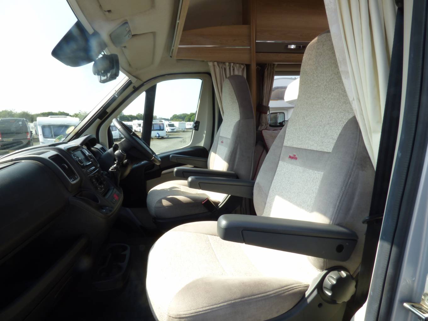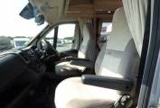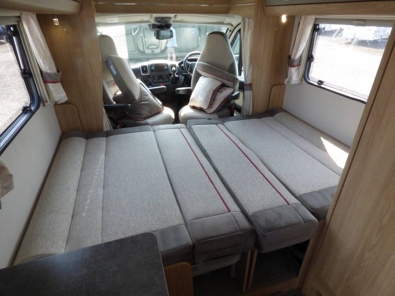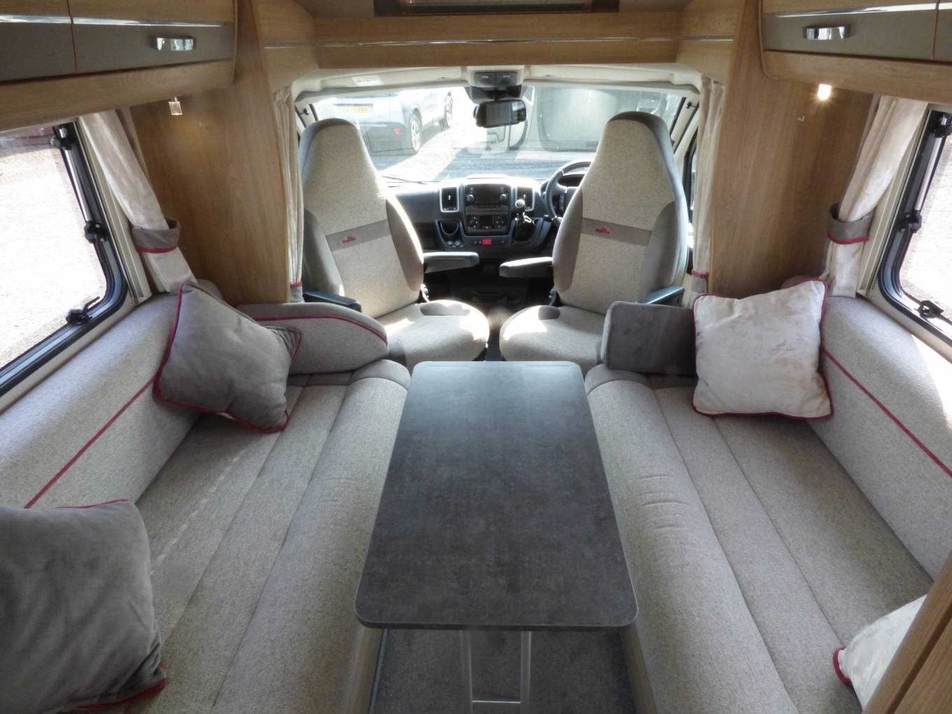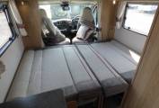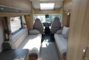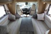 The cab has a 2.2l Peugeot engine, Remis style blinds for all the windows, media unit with satnav and 2 "Captain" style swivel seats. Behind the cab is the dinette area with 2 bench seats, large side windows and a collapsible table, stowed in the wardrobe. This area also doubles as the sleeping accommodation by pulling the benches together and reordering the cushions - nothing of a job.