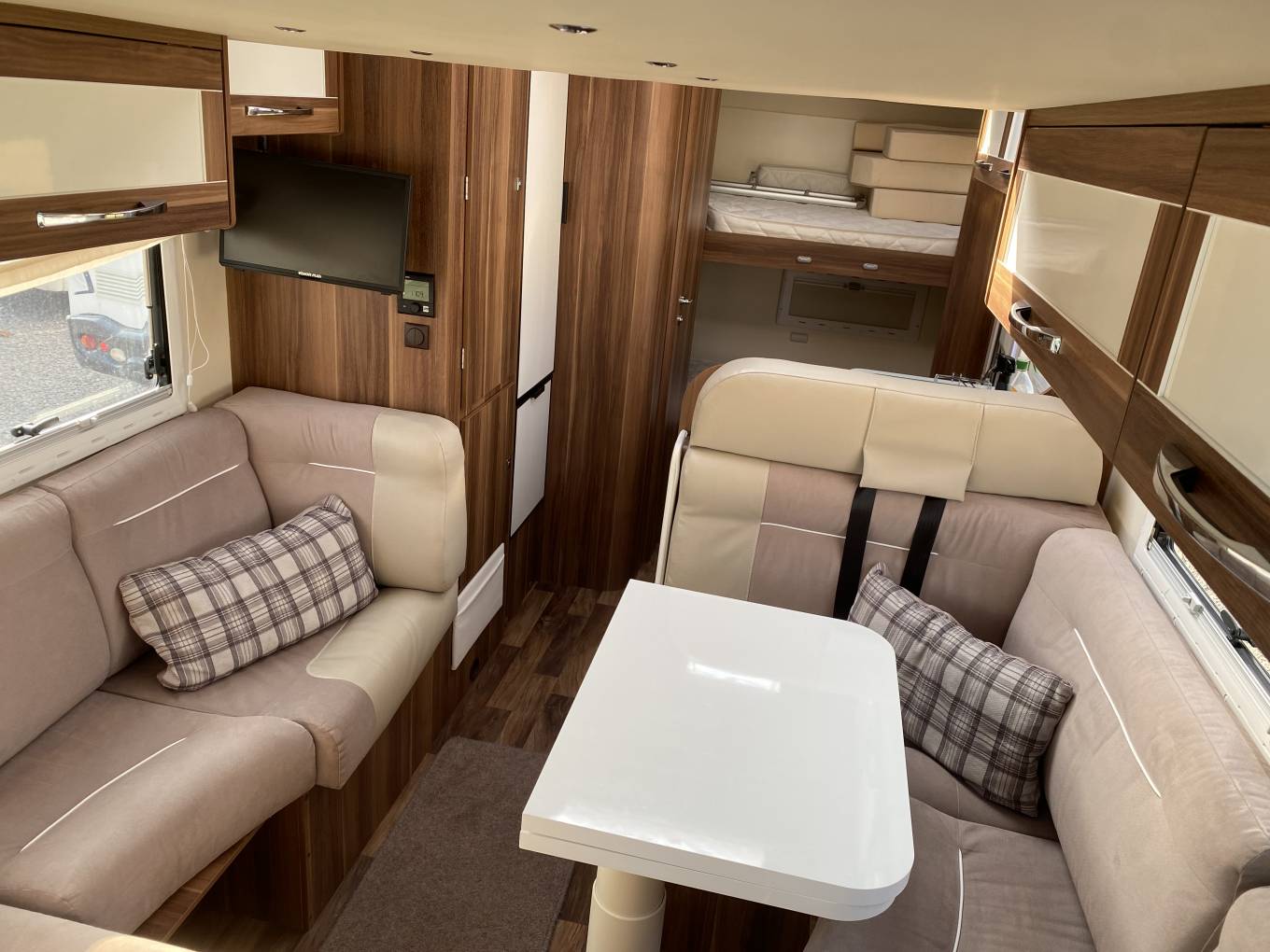 Sleeping – Electric drop-down double bed over the lounge area with safety net. 2 Rear bunks, Lounge area could be adapted in to an additional bed. 240v sockets and TV aerial point.