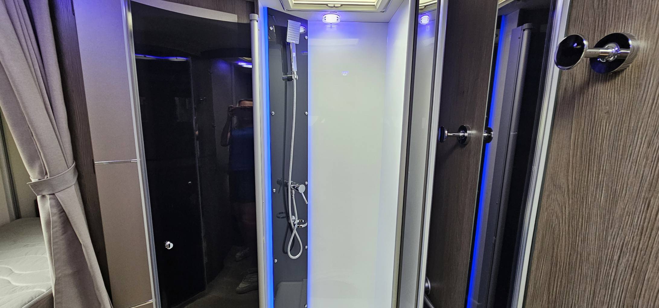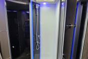 The central kitchen is equipped with a fridge with auto energy setting and separate freezer, 2-burner gas hob with electric hot plate, oven/grill, and stainless steel sink. Opposite is the washroom, which includes a separate shower cubicle, toilet, and basin.