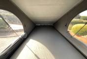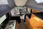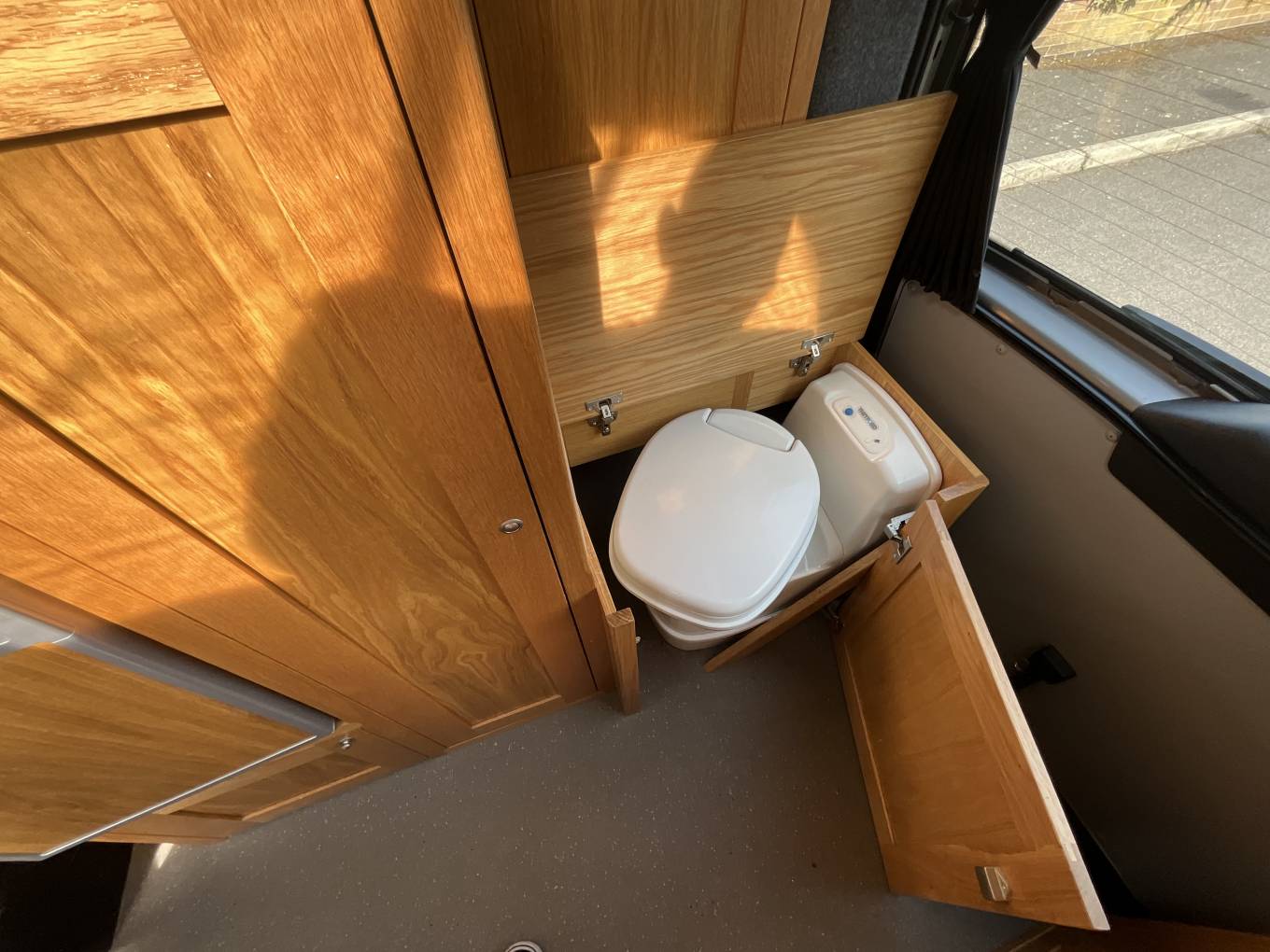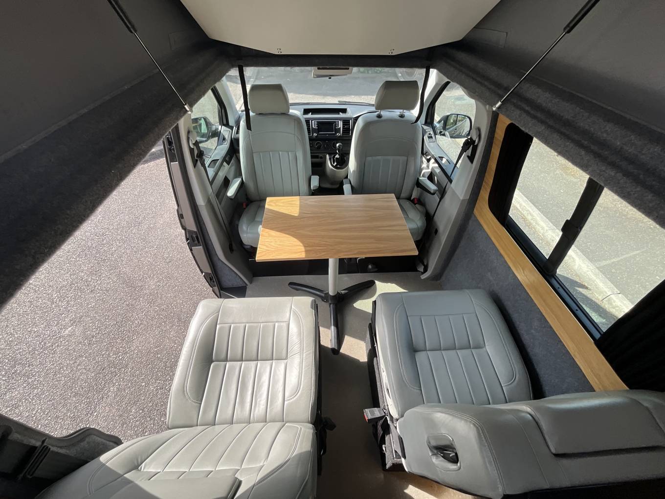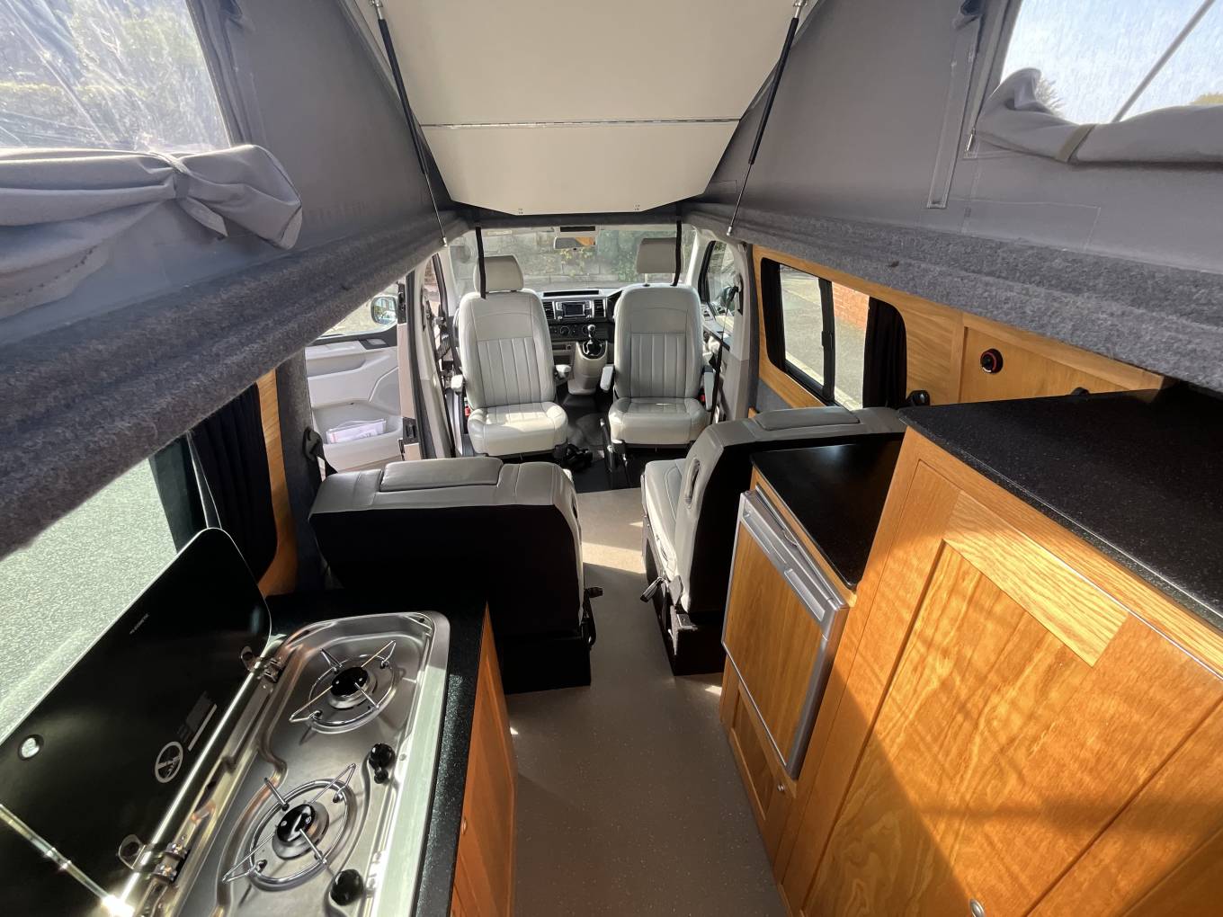 The Livingstone from Rolling Homes is an award-winning four berth VW conversion that offers sleeping capacity for four and four travelling seats in a versatile layout that’s perfect for families with older children or those looking for more space. The twin rear rib seats feature 3 point seatbelts to offer safe travelling for rear passengers. By utilising the front swivel seats, 4 can comfortably dine around the stand alone table. The rear seats can also be used to create two single beds or move together to create an optional double. The SCA pop top roof hinges from the front to give standing room in the rear kitchen or when using the foldaway cassette toilet, while also housing a comfortable double bed that can accommodate two adults and is TUV and VW approved. The rear kitchen features a double hob and sink combination under which is a large amount of storage. Opposite this is the fridge complete with ice compartment, a wardrobe with shelves for clothing and the fold away Thetford cassette toilet. Being a rolling homes conversion all the internal cabinetry is made from oak, the worktops are Corian and the insulation uses natural sheep wool.