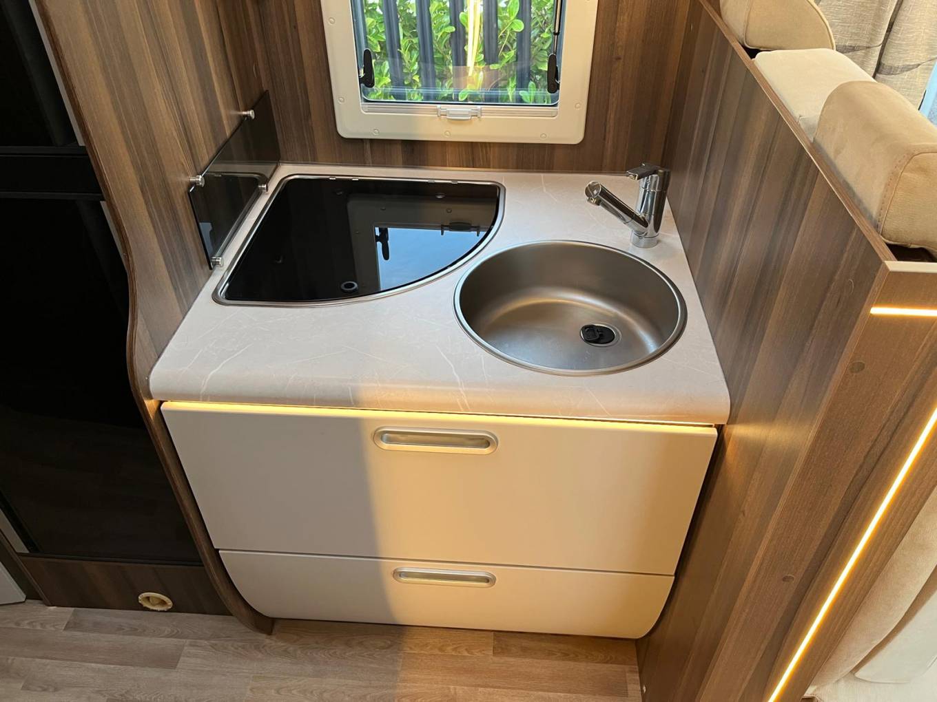 Fully fitted kitchen with 3-burner hob, sink, and 89 L fridge (141 L option) |