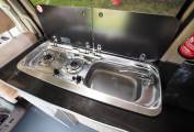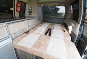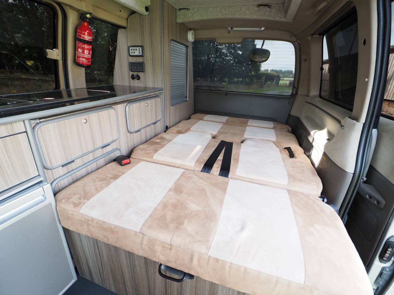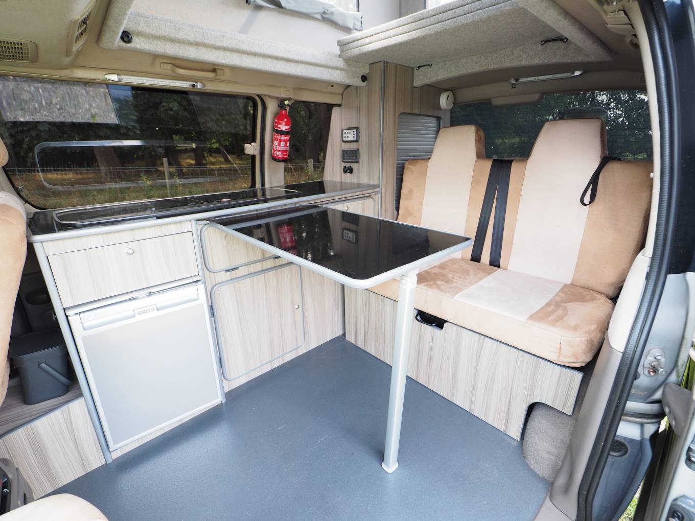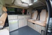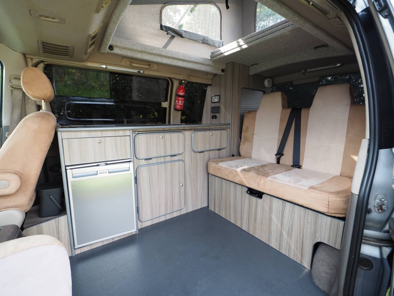 Up front there is a Sony entertainment system with apple and android carplay allowing you to hook up to your phone for Google maps Sat Nav. Passenger seat swivels into the main habitation area for additional seating options. All furnishings in grreat order and finished in a soft nubuck/suede effect cloth. The rear seat pulls out to provide a large double bed and there are kitchen facilities with a 2 burner gas hob, sink and 12v fridge with freezer box. Power comes from 12v electrics and 230v electric hook up and a gas bottle in rear locker is provided. Plenty of storage for all your bits and pieces and there is an awning included. The poptop allows standing room and has roof boards that could accomodate a sleeping space for a child or to use for storage.
