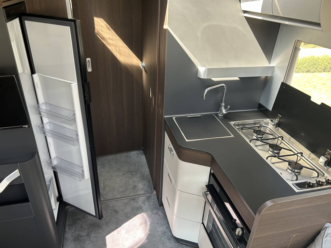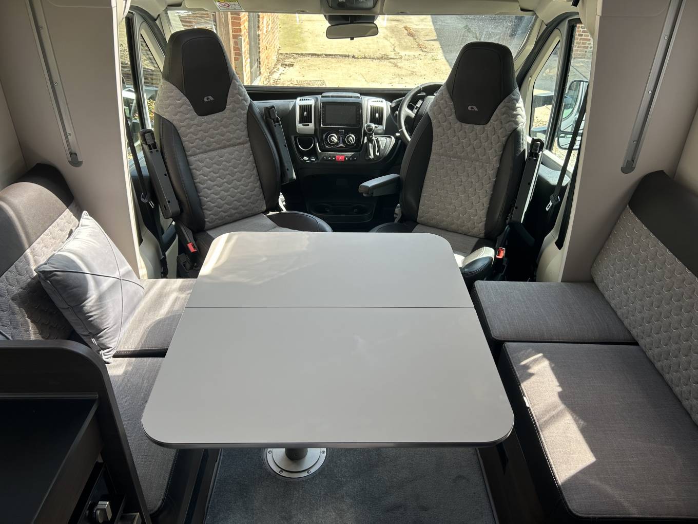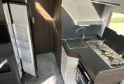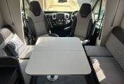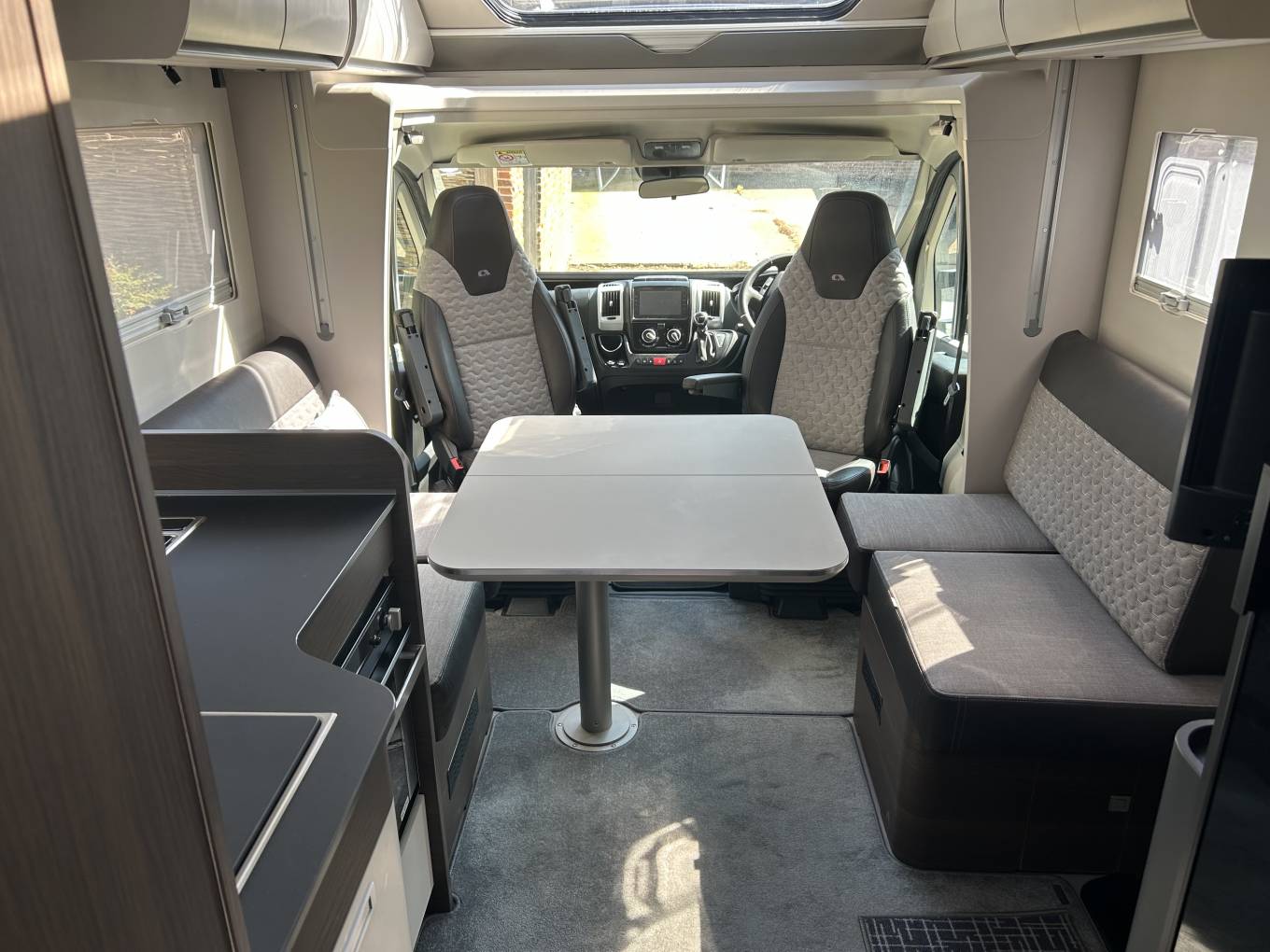 The layout of this motorhome is fantastic and makes the most of the space available. This model comes with the fold away travel seats giving you a more spacious lounge. This comprises of the two captains chairs and a further two double side facing sofas. In the centre there is a large table that can be folded and moved when not in use. The motorhome comes with two TV's and is also wifi ready.