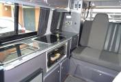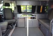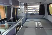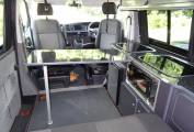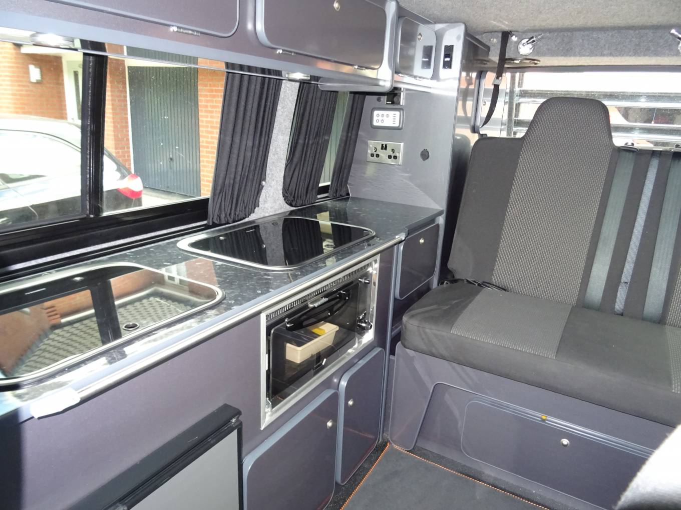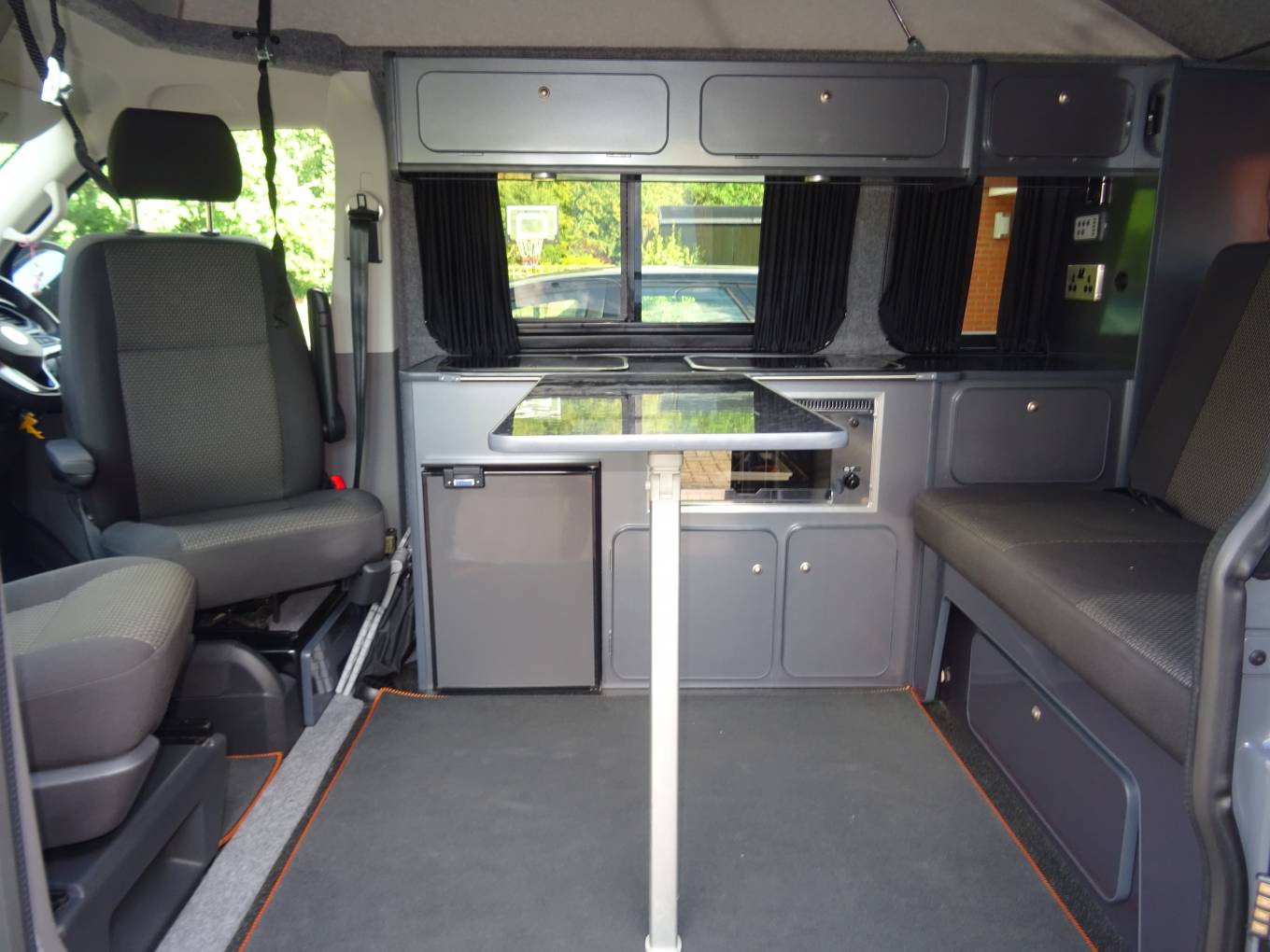 As you enter the side door you have slimline kitchen area with sink, 2 gas rings, fridge, work top, grill, good storage space. To the front both front seats swivel round making the central seating area very comfortable and a great socialising and dining space. Additional comforts include a diesel heater, tables, privacy glass, curtains.