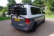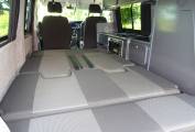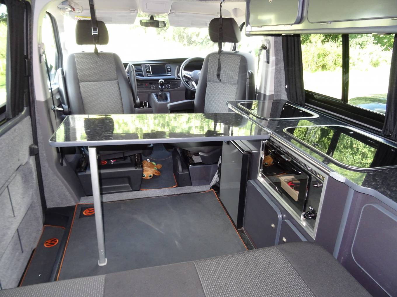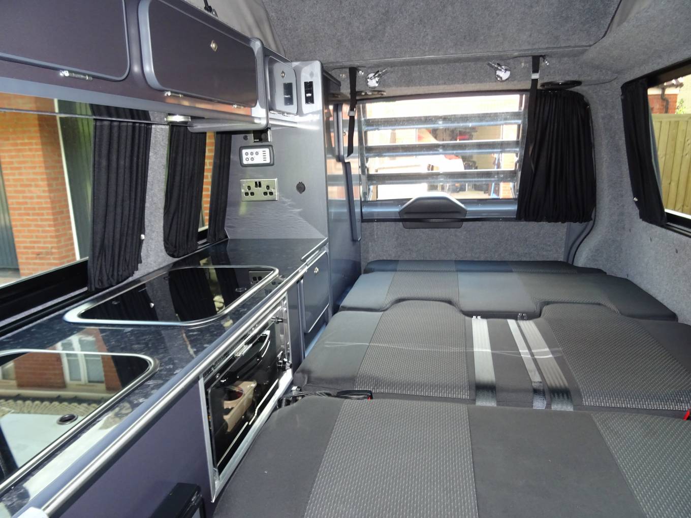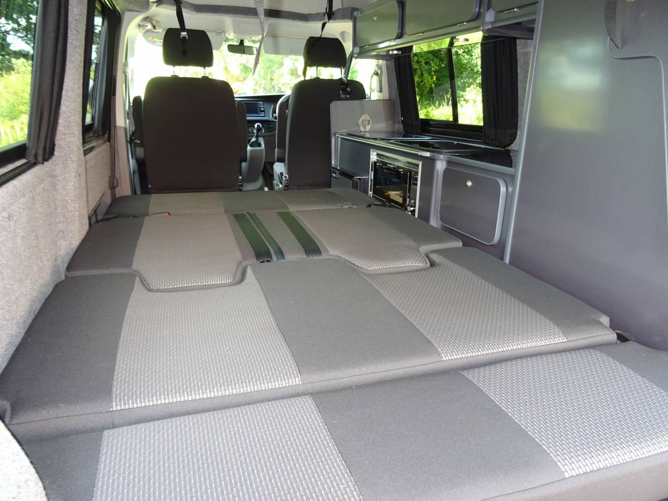 To the back you have the rock and roll bed that easily makes into a good size bed with storage underneath and 2 seat belts. The pop top bed comfortably sleeps 2 people. Other great features: cab air con, diesel heating system, Apple CarPlay, leisure battery, 4 cycle carrier, solar panel, cruise control, down lighting, Alloy wheels, front and rear parking sensors and plenty of storage through out.