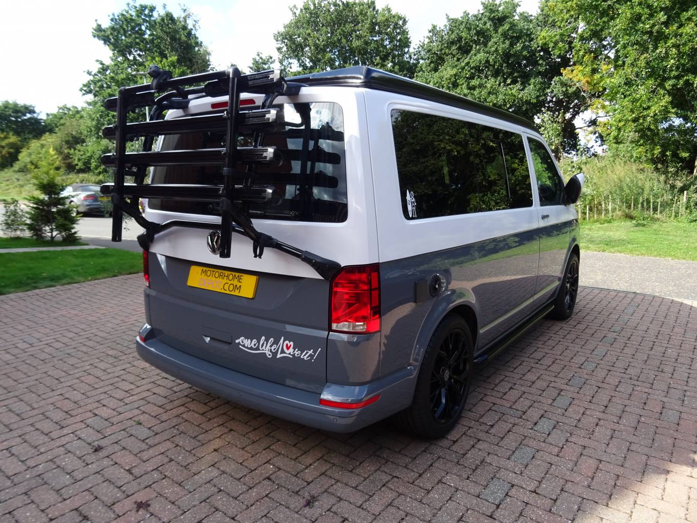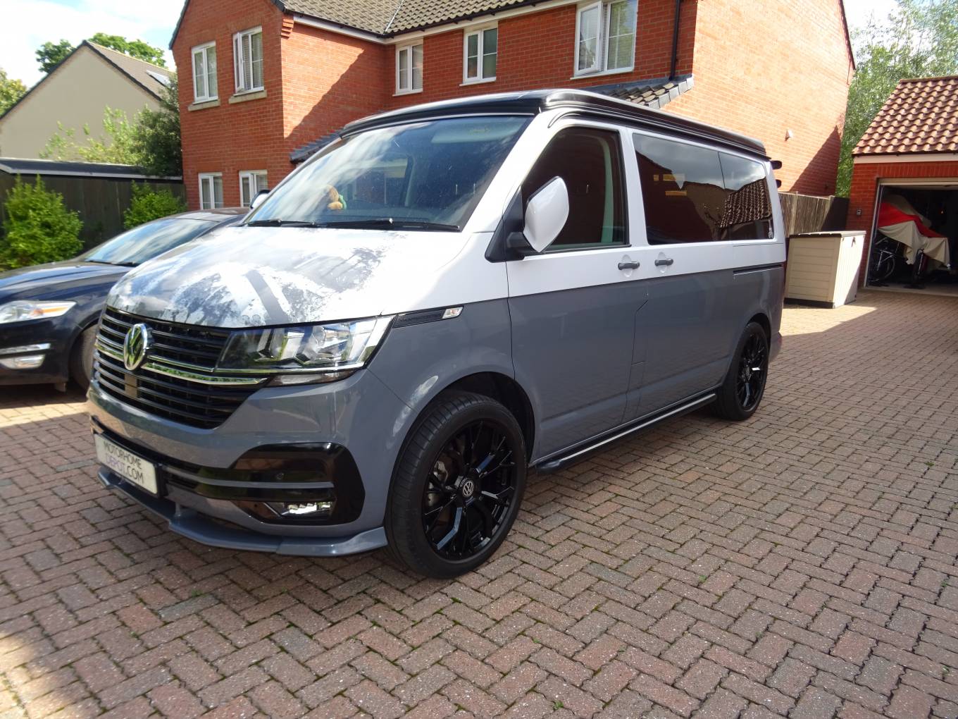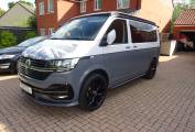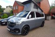 This stunning 4 Berth Volkswagen T6.1 Highline SWB T28 Manual gearbox with Pop Top and only 9,593 miles converted by Cambridge Campers with the Euro 6-compliant engine meets stringent emissions standards. This VW looks really stylish in the grey and white with a very high quality finish inside. Located in the Norwich area.This camper offers a perfect blend of comfort, functionality, and modern convenience.