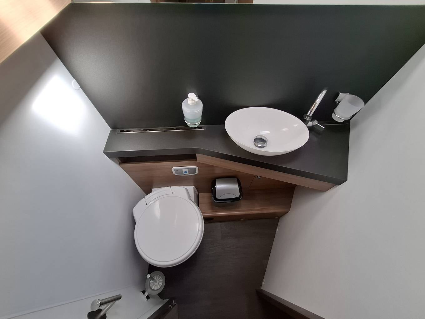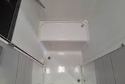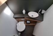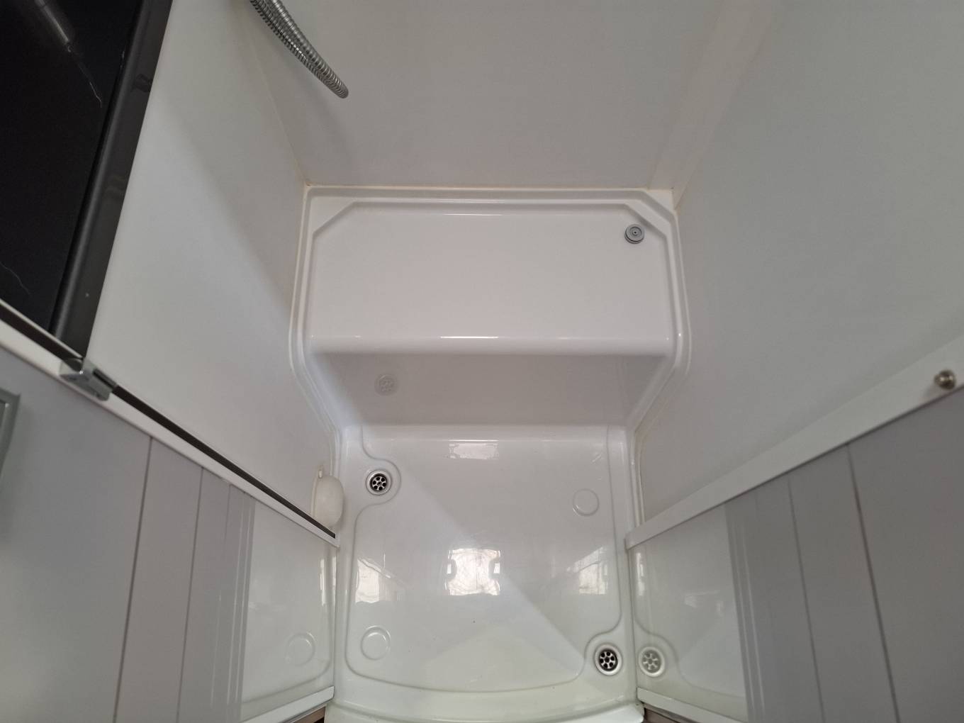 Progressing through the vehicle, there is an compartment with a toilet and hand basin, and a separate shower cubicle opposite.