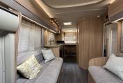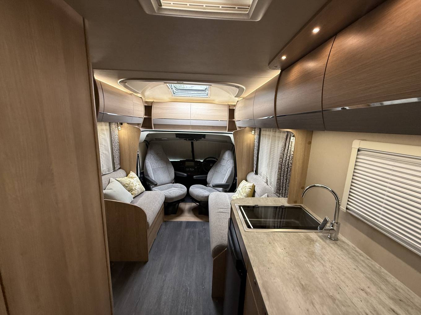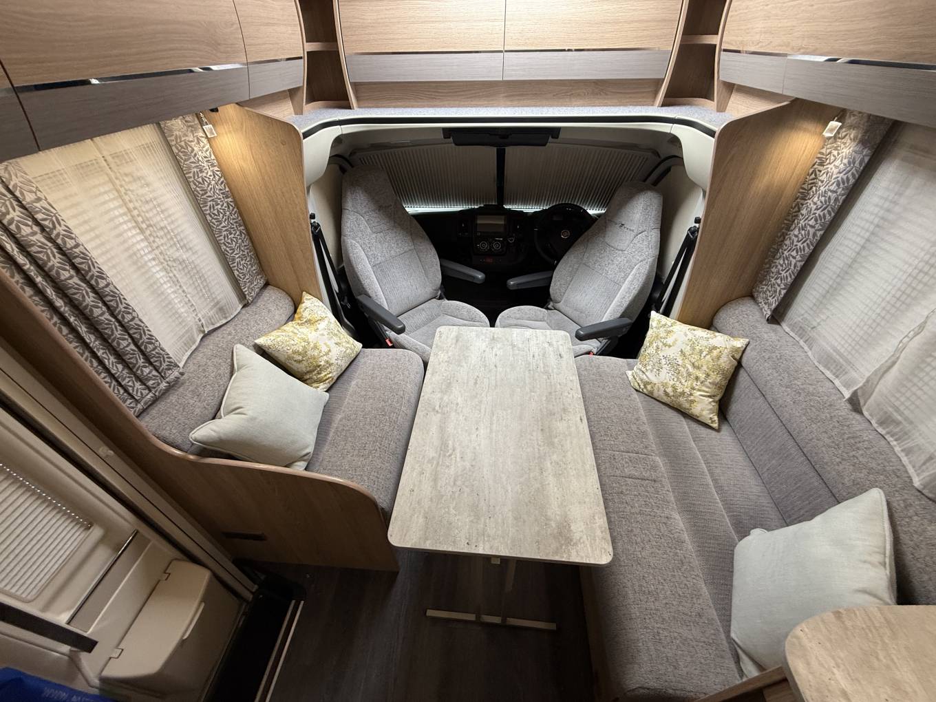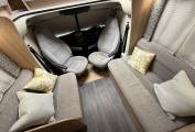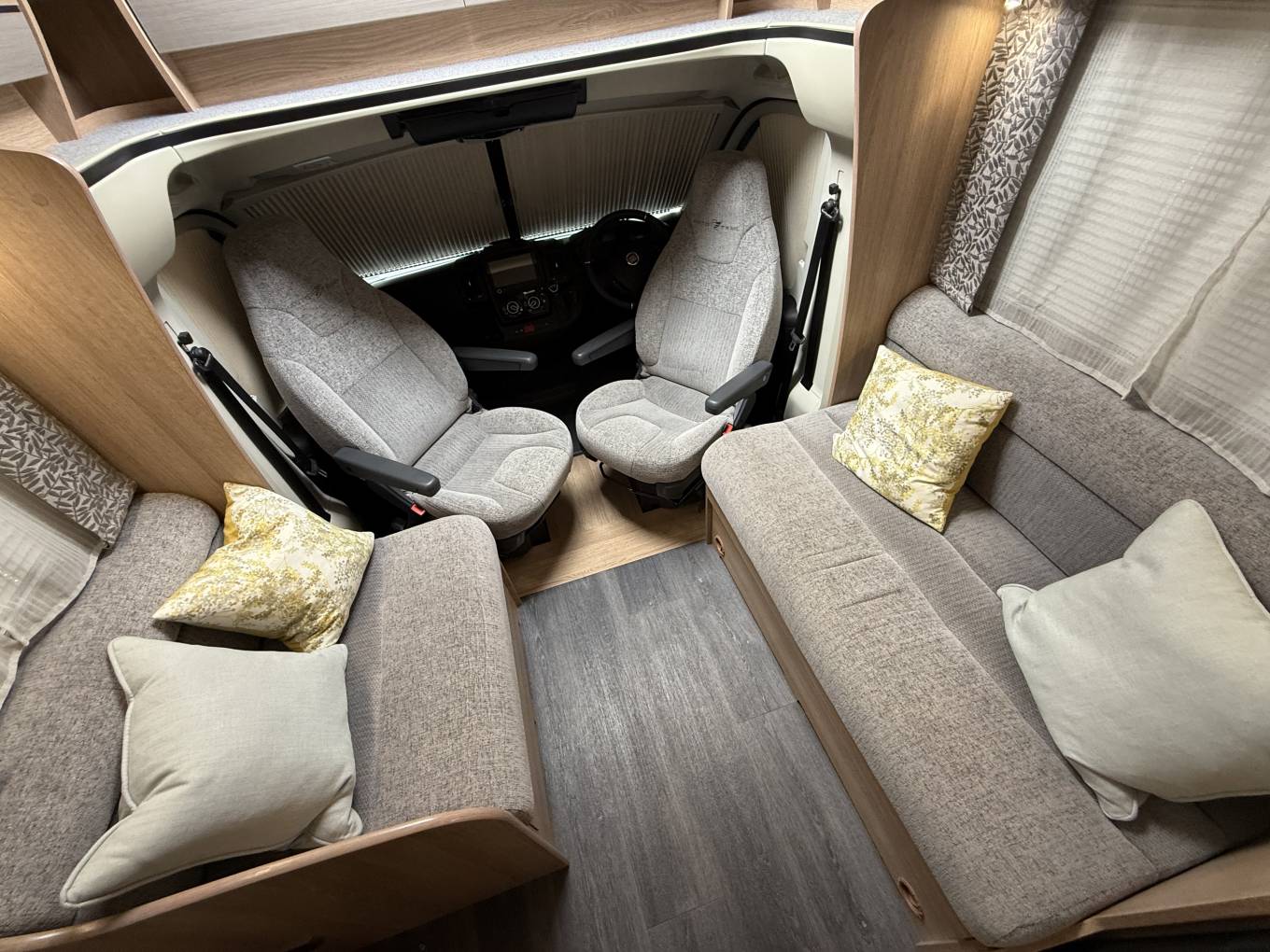 On entering via the Habitation door, to your left is the lounge area consisting of an offside two seater settee, a smaller seat on the other side and twin swivelling Cab Chairs.