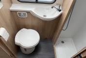 To your right is the bathroom where you will find a Thetford Flushing cassette Toilet, a Wash Handbasin and a Shower Cubicle.