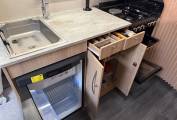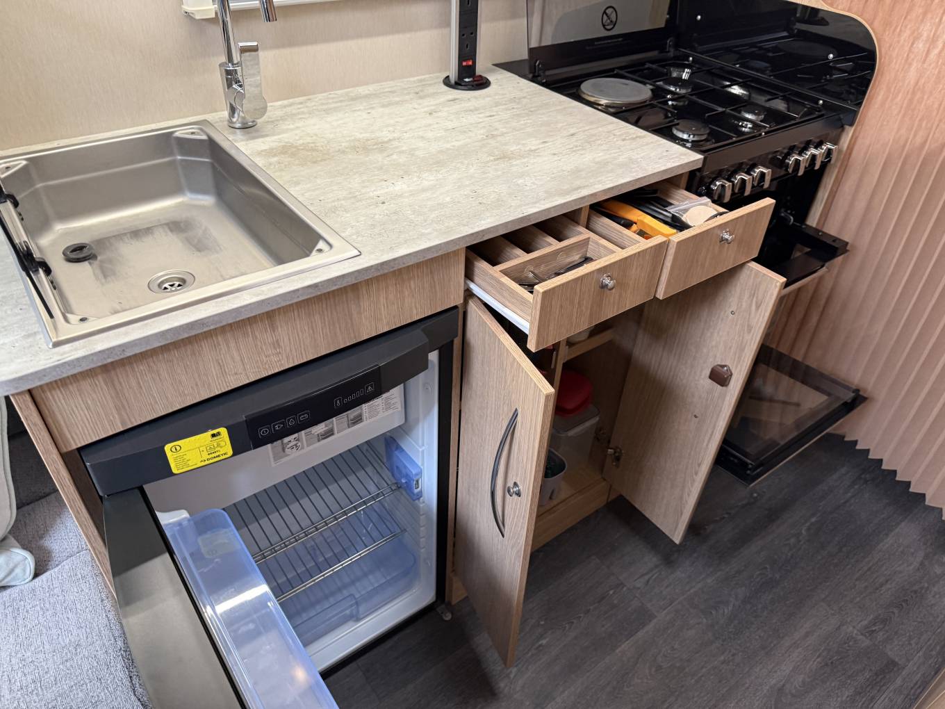 Opposite is the hight equipped kitchen where there is a Three Burner Gas and One Electric Hotplate Hob, a separate Grill and Oven, a Three Energy Source Dometic Fridge, a Microwave Oven, a Sink with Hot and Cold Mixer Tap plus plenty of cupboards and worktop space.
