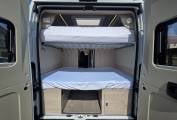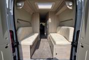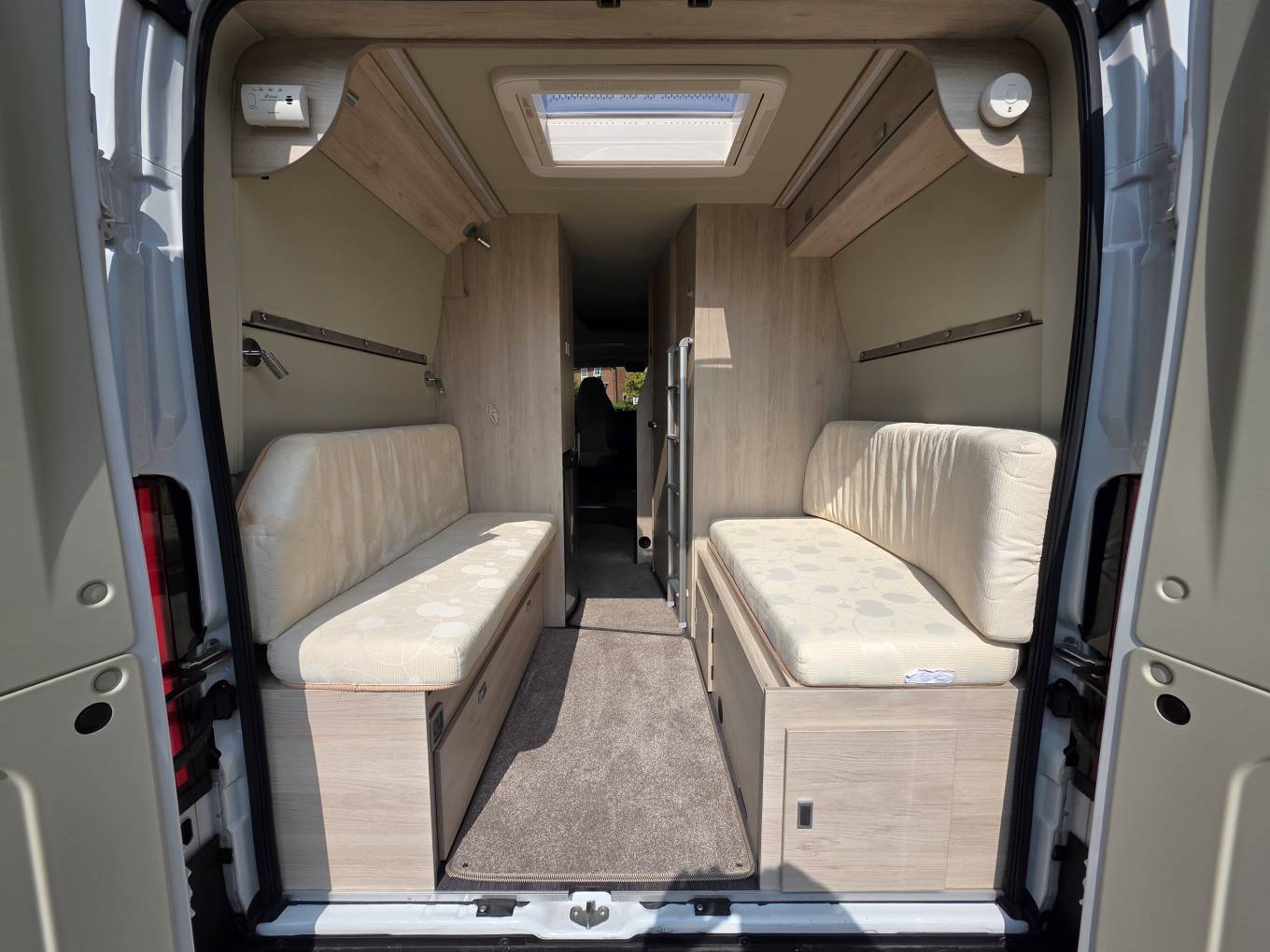 At the rear, the motorhome has a clever design feature. The two transverse beds are positioned so that one double is below and another above, however these can be removed to make up additional storage, to make a garage space below the higher bed. This allows room for a large number of items including bikes, whilst leaving a transverse double bed up top. Alternatively, you can leave the lower bed in and use it as a comfortable two berth motorhome, with the option of a rear lounge.