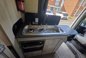The kitchen positioned in the middle of the Toleno by the sliding habitation door is fully equipped with gas hobs, oven and grill, spacious fridge freezer and fold out preparation space for serving.