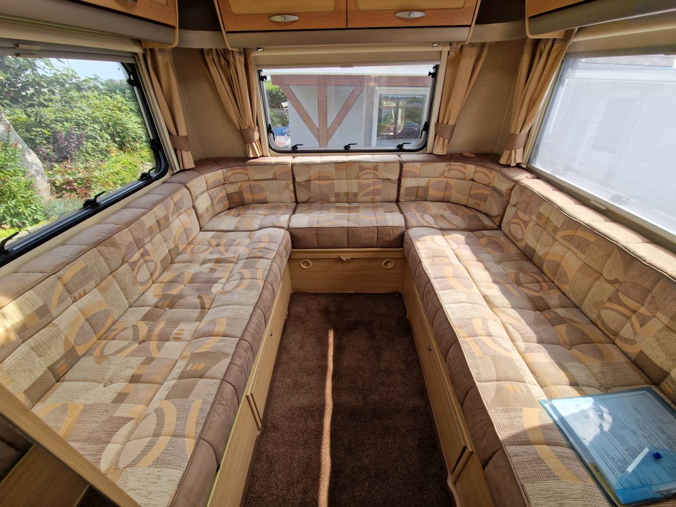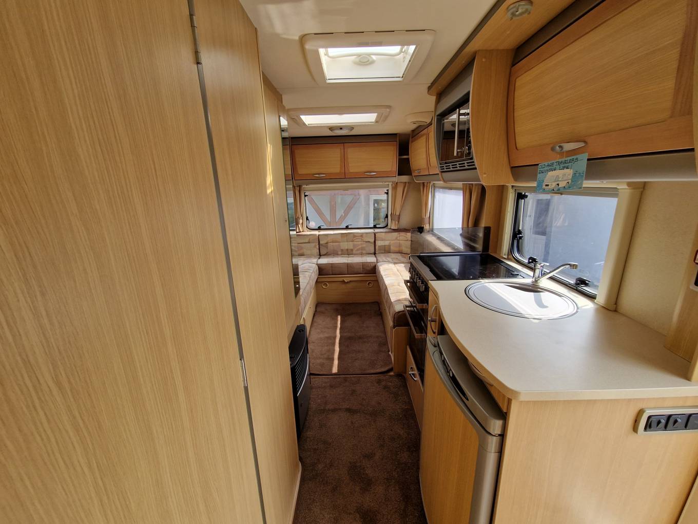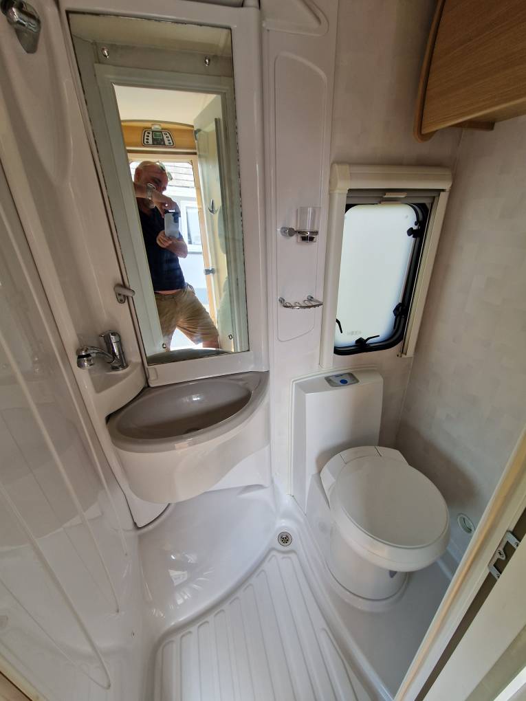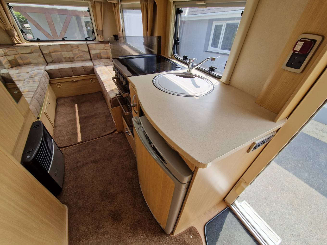 Moving forward the side kitchen comprises a dual-fuel hob, oven with separate grill, microwave, sink and 3-way fridge. Opposite sits the bathroom with shower, vanity sink and toilet. There is ingenious hinged door to partition off and create a separate shower enclosure or a larger washroom when not in use. Heating and water are run by gas or mains hook-up when available. Ample storage ensures you can take all those important bits and pieces away without worry.