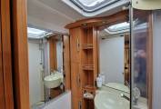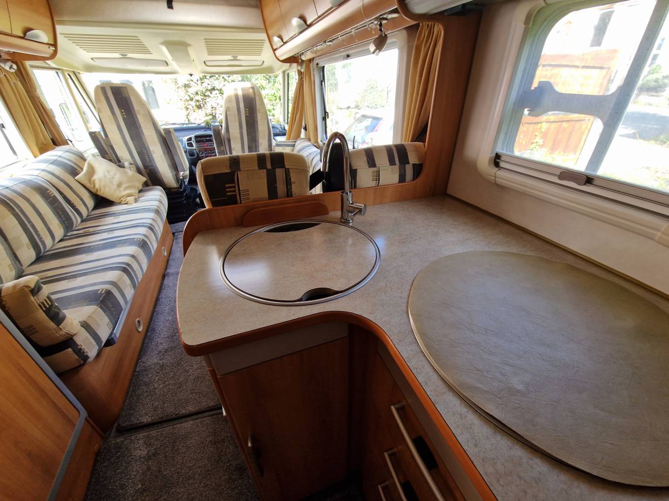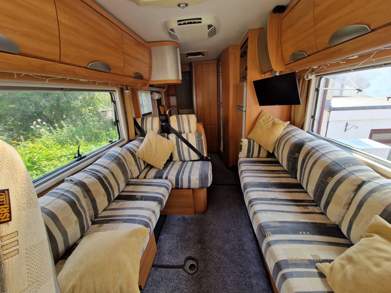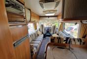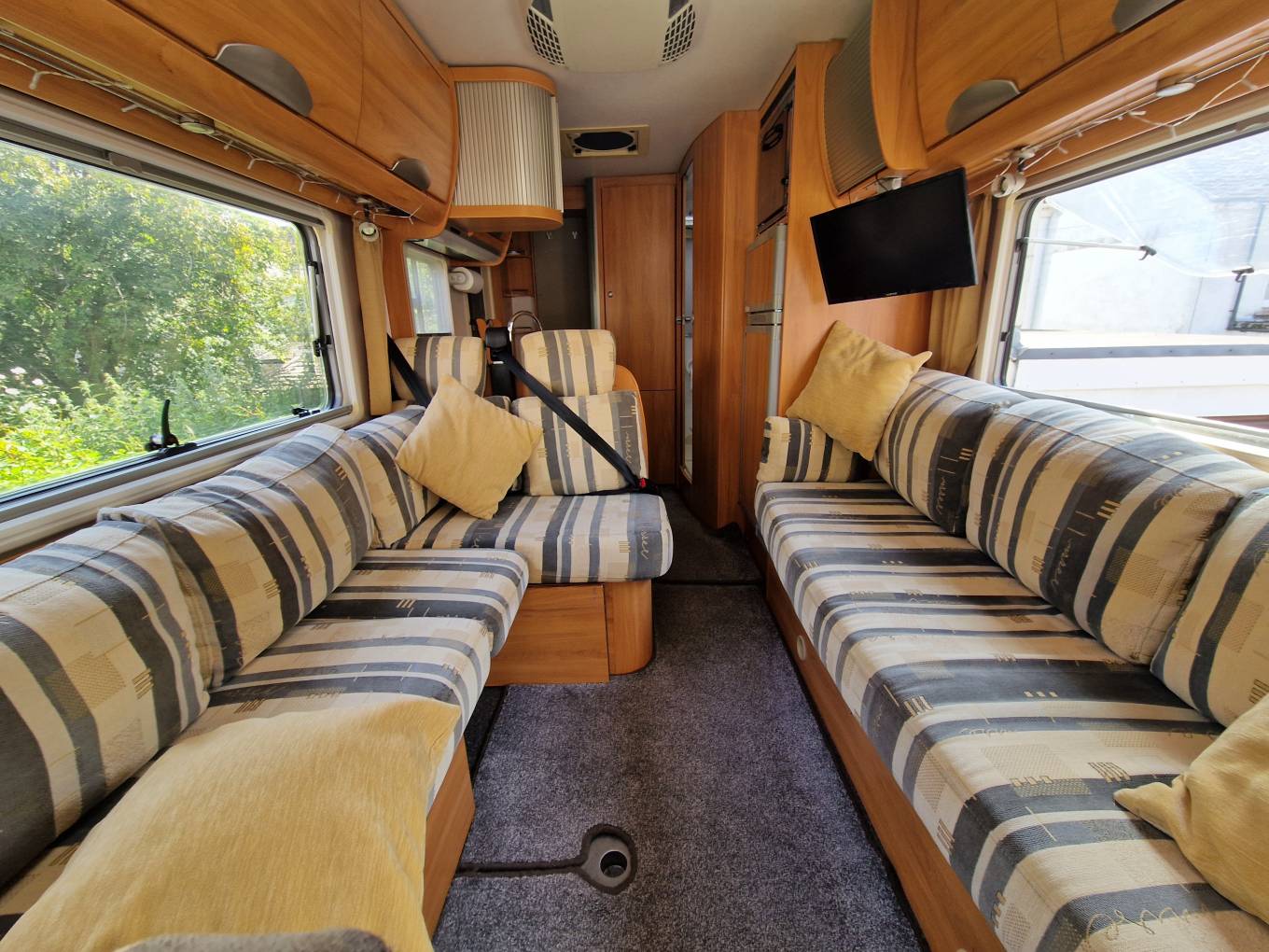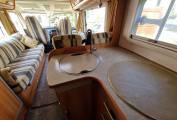 The habitation area is entered through the rear door and is dominated by a spacious and comfortable lounge. An L-shaped sofa with opposite bench sofa allows you to entertain six guests with the TV, or just stretch out and keep it all to yourselves. A large skylight and large side windows makes for a bright and airy space to relax. At night this area can convert to a double or 2 singles.There are two 3-point seat belts in the forward-facing lounge seats allowing four travellers in total. The furnishings and fittings in the motorhome reflect its German quality and are in excellent condition.The habitation area also benefits from a roof-mounted AC unit which is an extra rarely seen except in very high-spec motorhomes.