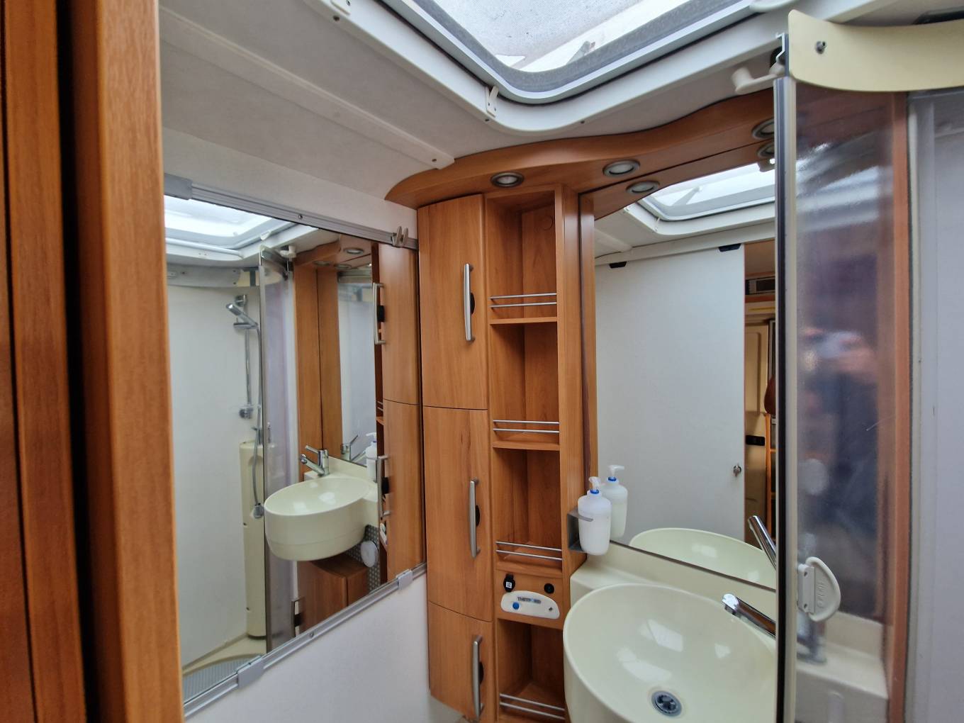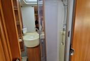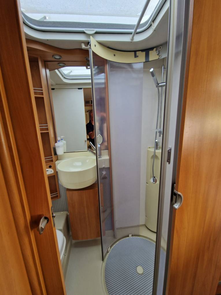 A large washroom sits in the rear corner with vanity sink unit, cassette toilet and enclosed shower cubicle.