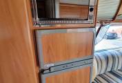 To the rear of the motorhome is a well-equipped kitchen comprising 3-burner hob, combi-oven, 3-way large fridge/freezer, sink and plenty of cupboard space for all your cooking needs.
