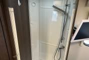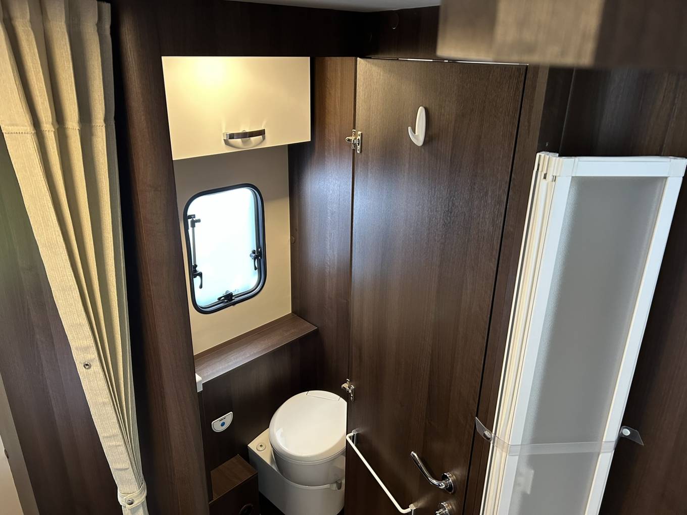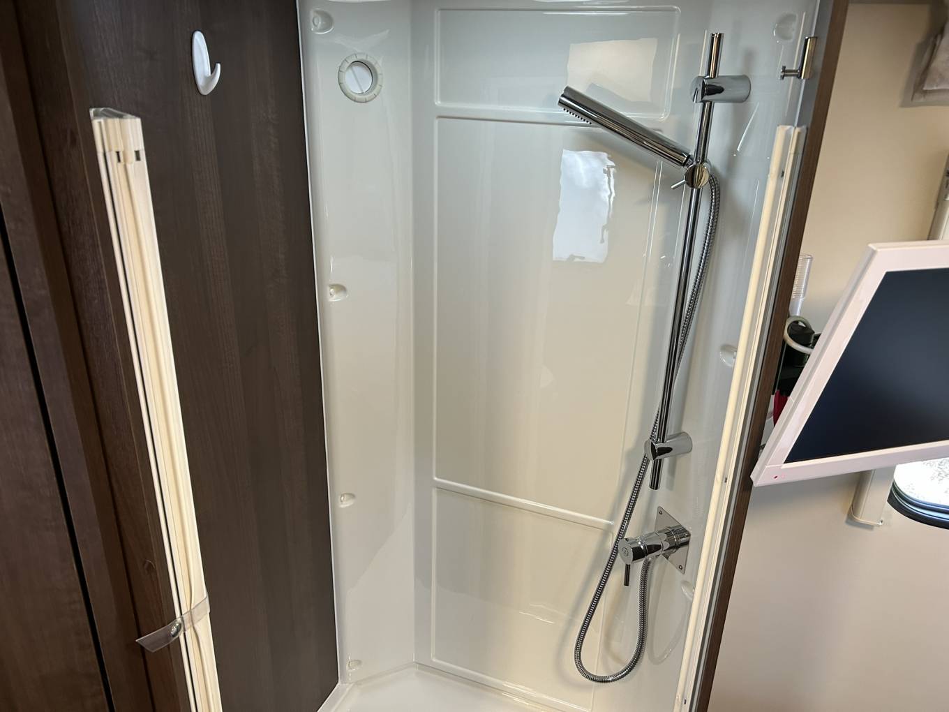 Next is the separate shower cubicle on the left hand side with cassette toilet, hand basin/vanity unit and mirror opposite. There is a door that can be used as the toilet door or used to separate the bedroom/bathroom from the rest of the van for privacy.