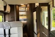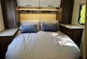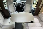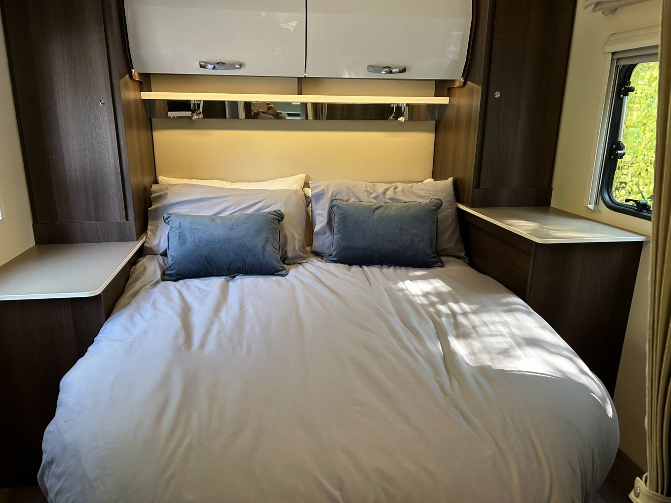 Behind this there is a comfortable dining area with large table. The forward facing bench seat has 2 seat belts and the side single seat also has a seat belt, these convert easily to the 5th bed completing the 5 berth configuration. Above the dining area is an electric drop down double bed which when raised is cleverly concealed into the ceiling space. There is storage under the bench and plenty of locker space above.