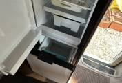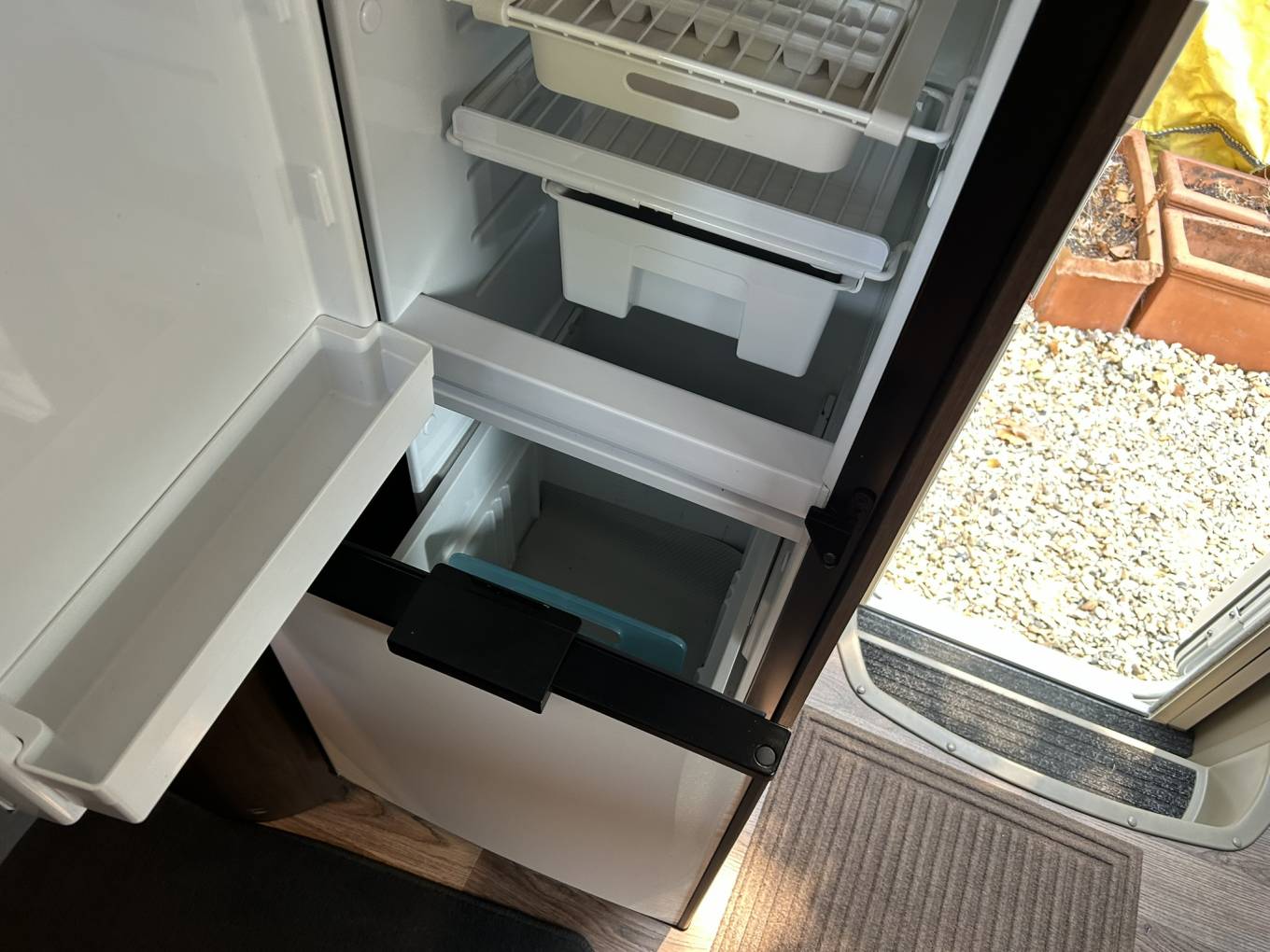 As you move down the van there is a fully equipped kitchen with a large fridge freezer, oven, microwave, 3 ring gas hob and sink with mixer tap. There is plenty of cupboard and locker space for all your kitchen essentials.