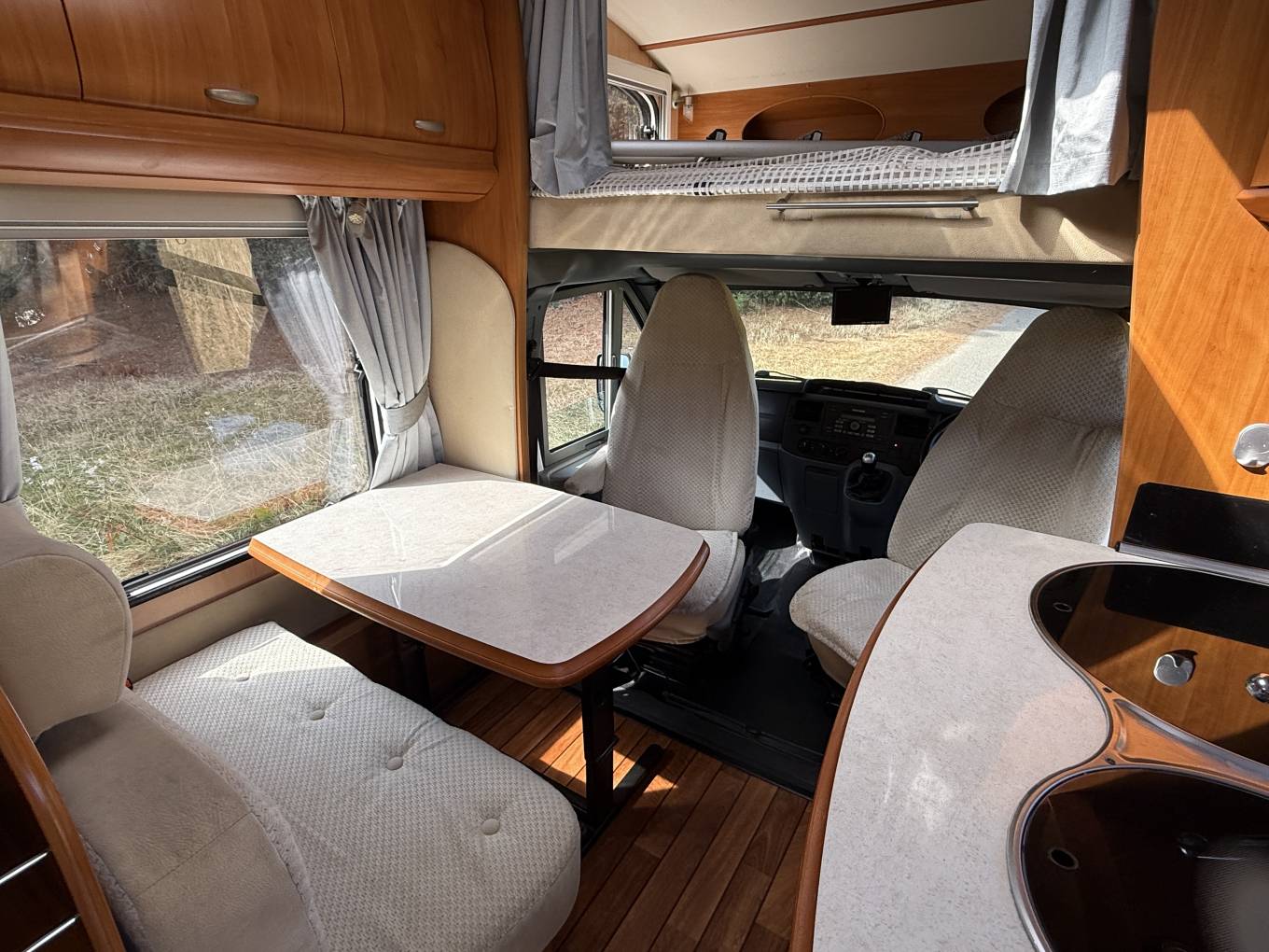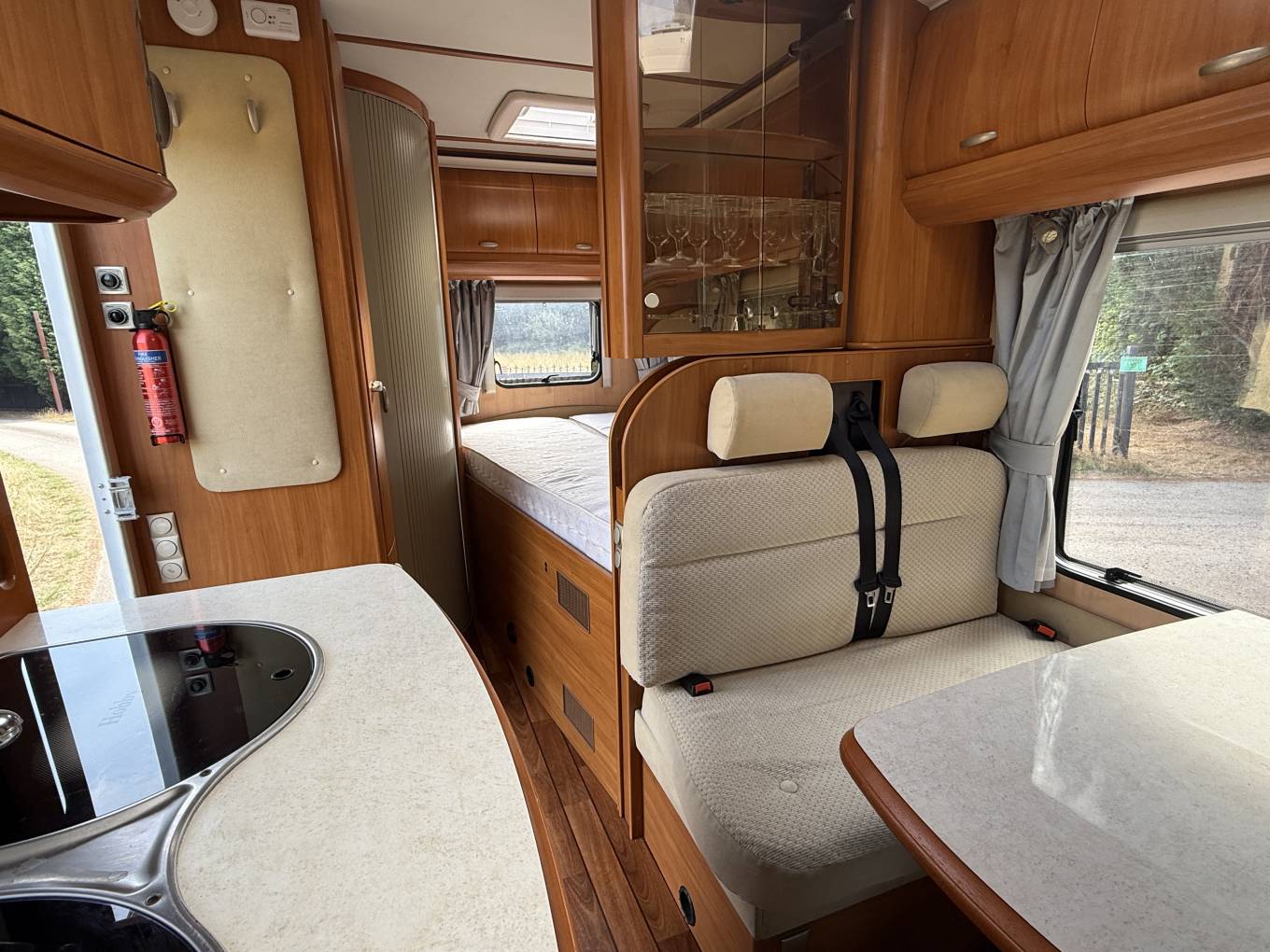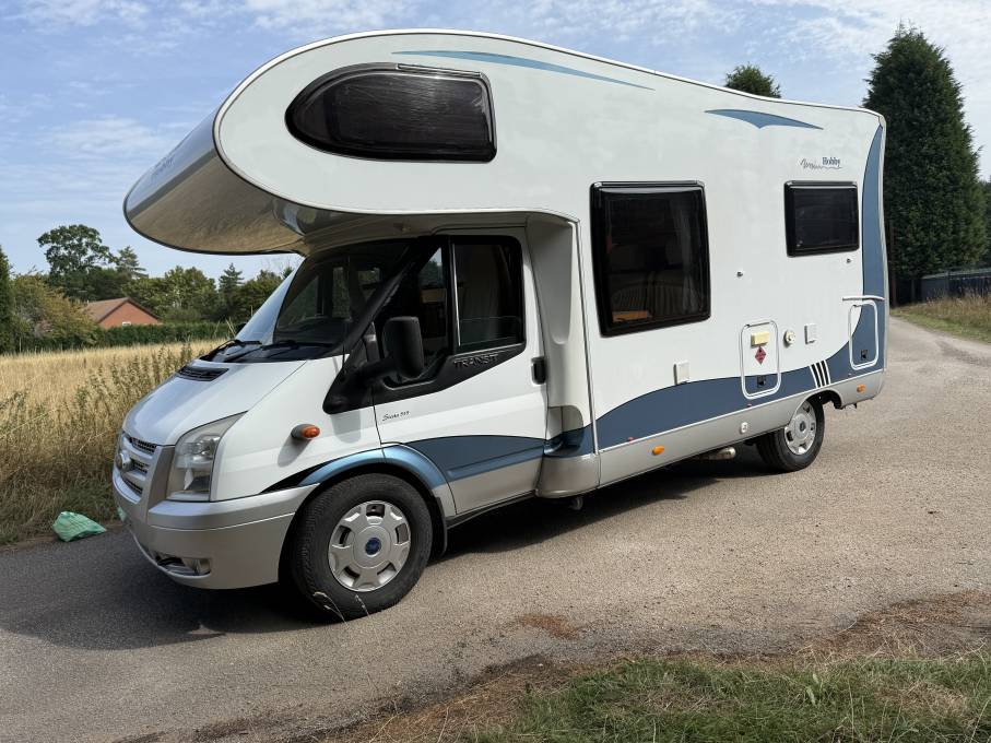 HOBBY SIEATA 555 with 4 travelling seats and generous accommodation. The 555 has a French bed to the rear of the motorhome with a washroom to the side, a mid dinette with ample space to dine 5 guests, a side kitchen complete with fridge freezer, sink and oven, and large overcab double bed. The Ford cab is comfortable and fitted with air conditioning. Externally there ia a large wind out awning and substantial tow bar. Good sized accommodation with 4 travelling seats, 2 double beds and a comfortable loung/dining area. Just completed full habitation inspection, please ask for a copy. New MOT to August 2026.
