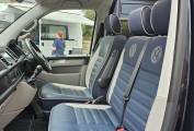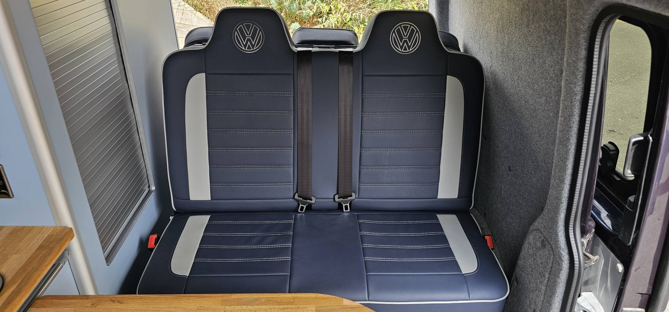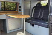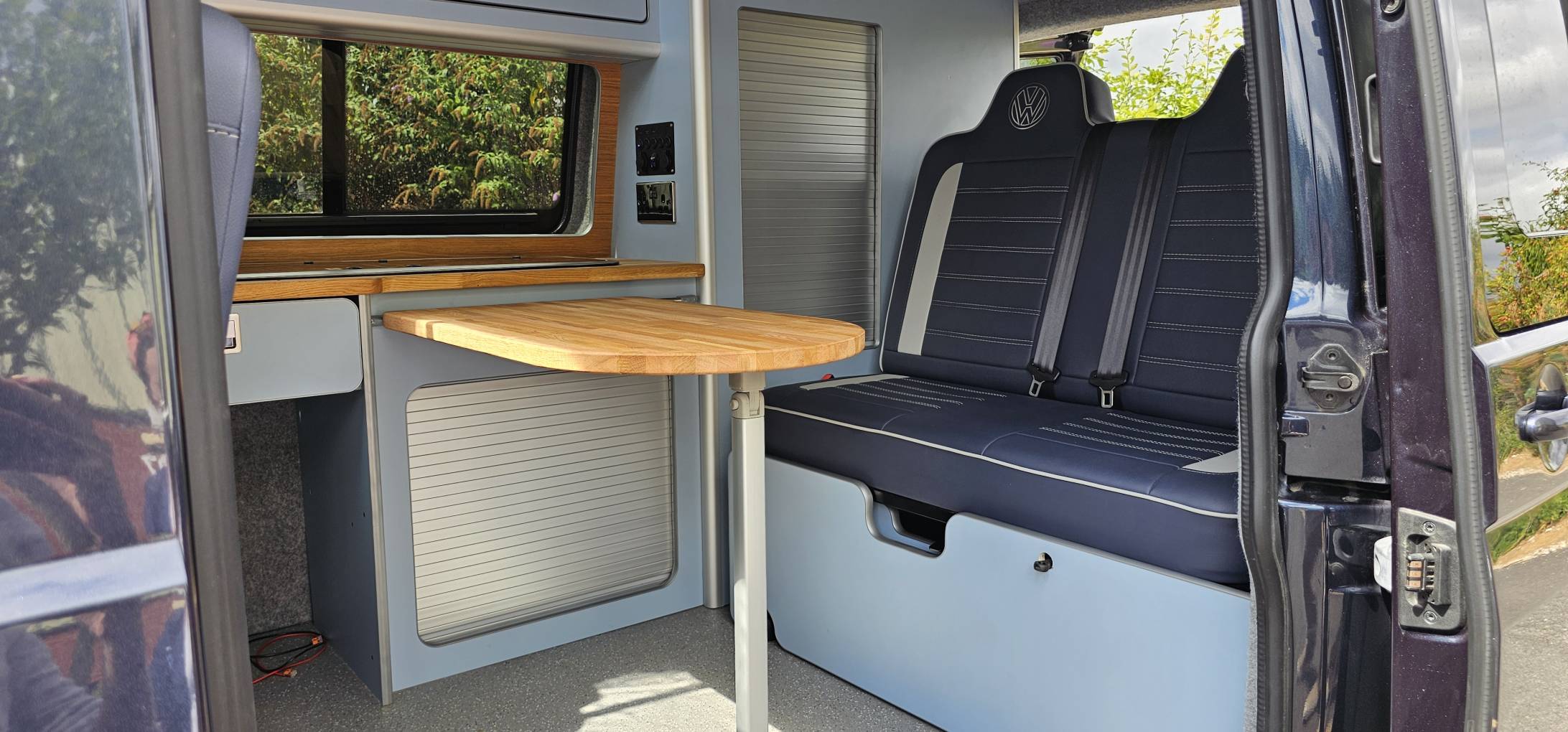 This vehicle has a light blue kitchen with oak worktop and adjustable oak table arrangement.