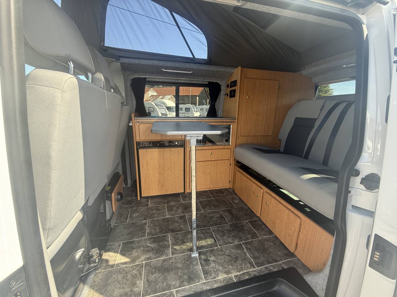 This campervan has a temperature controlled Webasto diesel heating system fitted, 5 Seatbelts, Rock and Roll Bed with Easy Up / Down Mechanism, Fitted Windows (Including One Sliding), Large Swivel Front Passenger Seat, Tuck Away Dining Table, Gas 2 Burner Hob, Oven, Sink & Tap, Fitted Water Tank, Power Management Including: 240v Socket, 12v Sockets, USB Points, 1 x Leisure Battery, Insulated Floor & Walls, Ply & Carpet Lined, Upper Cabinets and Storage, Fridge with small freezer compartment, an Electric Mains Hook Up Outlet, Reversing Sensors and Thermal Window Covers. Upstairs the full lenght elevating pop top roof creates an open space providing room to stand and has three zipped mesh windows to allow air in and keep insects out and it has the facility to have a bed plinth and mattress avaivalble in this space if required. (bed plinth and mattress not included)