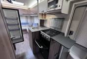 To the right of the entrance door is the well equipped kitchen consisting of a Three Burner Hob, and Oven/Grill, a Sink with removable drainer and chopping board, a Microwave Oven and a tall slimline Dometic Fridge.
