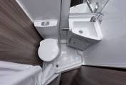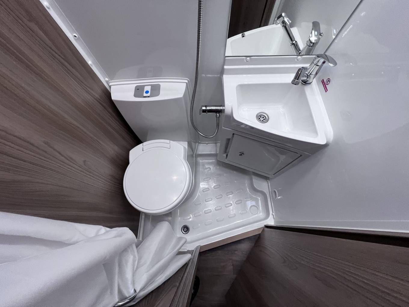Behind the forward facing seats is the wetroom style bathroom where you will find a Thetford Cassette Toilet, a Wash Handbasin and the Shower.