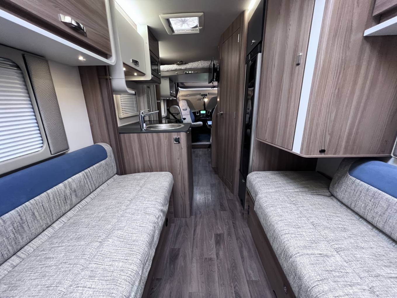 On entering via the Habitation Door, to your left is the Front Lounge consisting of twin forward facing belted seats, inward facing settees, a rear facing belted seat, twin swivelling cab Captains Chairs and a pedestal mounted moveable table.