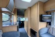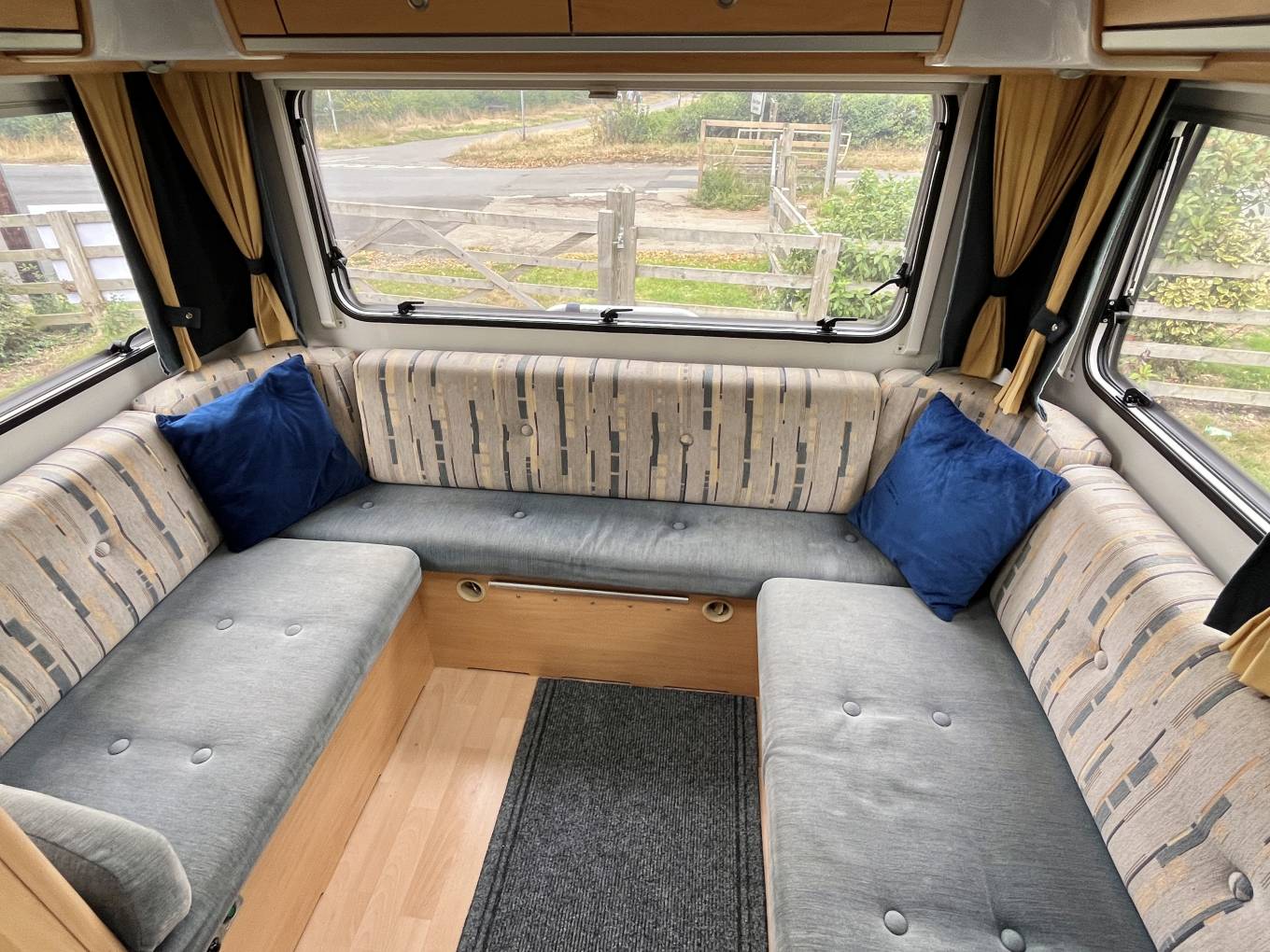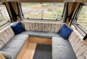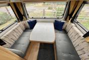 To the rear of the van is the u shaped lounge, the light floods into this socializing area via the three rear windows and by use of the removable table can also seat 4 people for dining, there is good storage above in the 6 overhead lockers, this area can be converted into a good sized sleeping area when required. Heating is provided by a Truma blown air system.